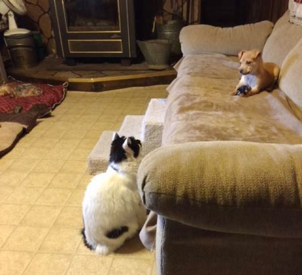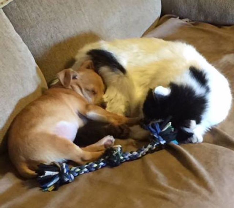 When Star came to her foster home, Stripe the cat invited himself into her crate so he could care for her.