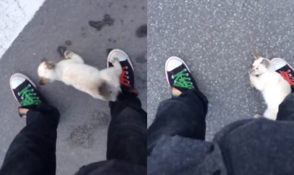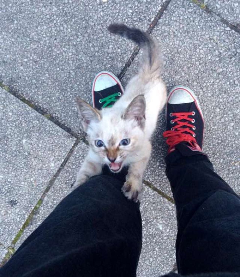 A young man was stopped by a little stray kitten who ran up to him in the park and asked him to take her home.