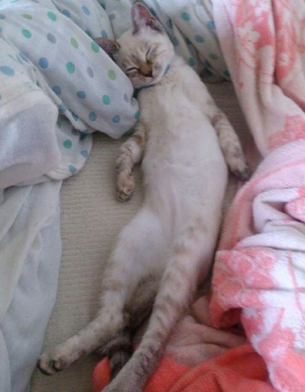 After getting home, the kitten cuddled comfortably next to him for a nap. She completely made herself at home.