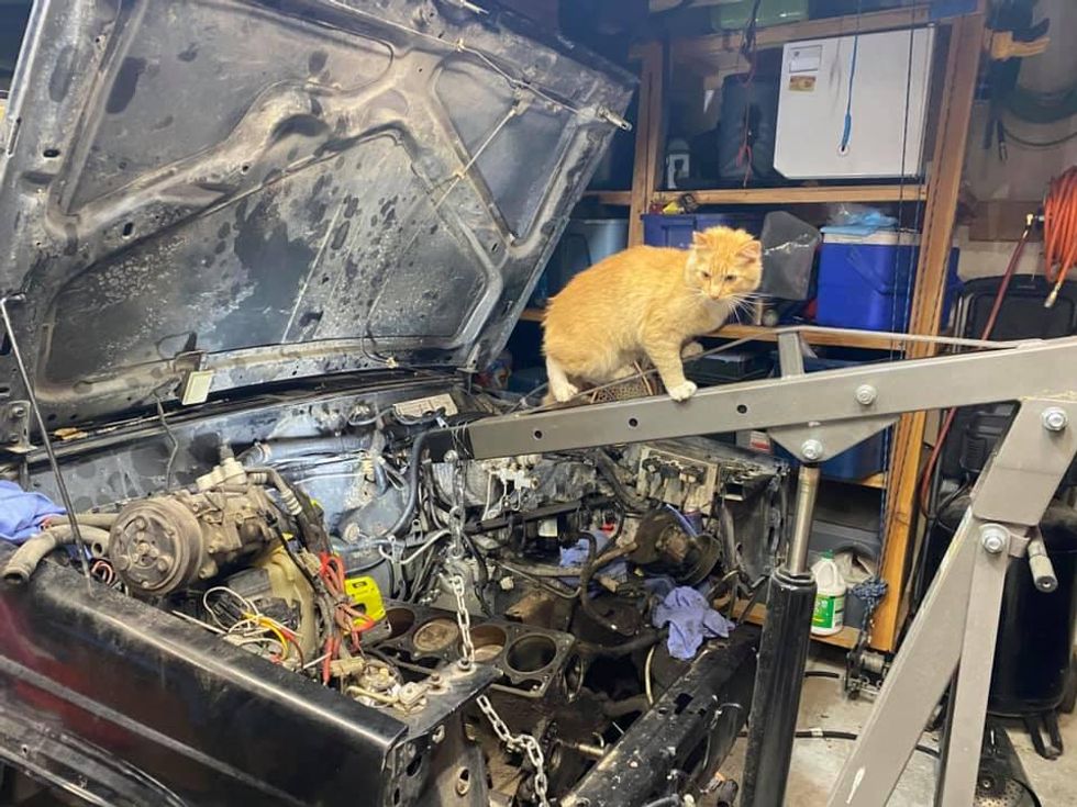 While he was fixing the vehicle, minding his own business, he noticed that a cat had made her entrance. A long-haired ginger kitty with white mittens had joined him for the occasion. She strutted about and nonchalantly hopped on the jeep as if to offer some assistance.