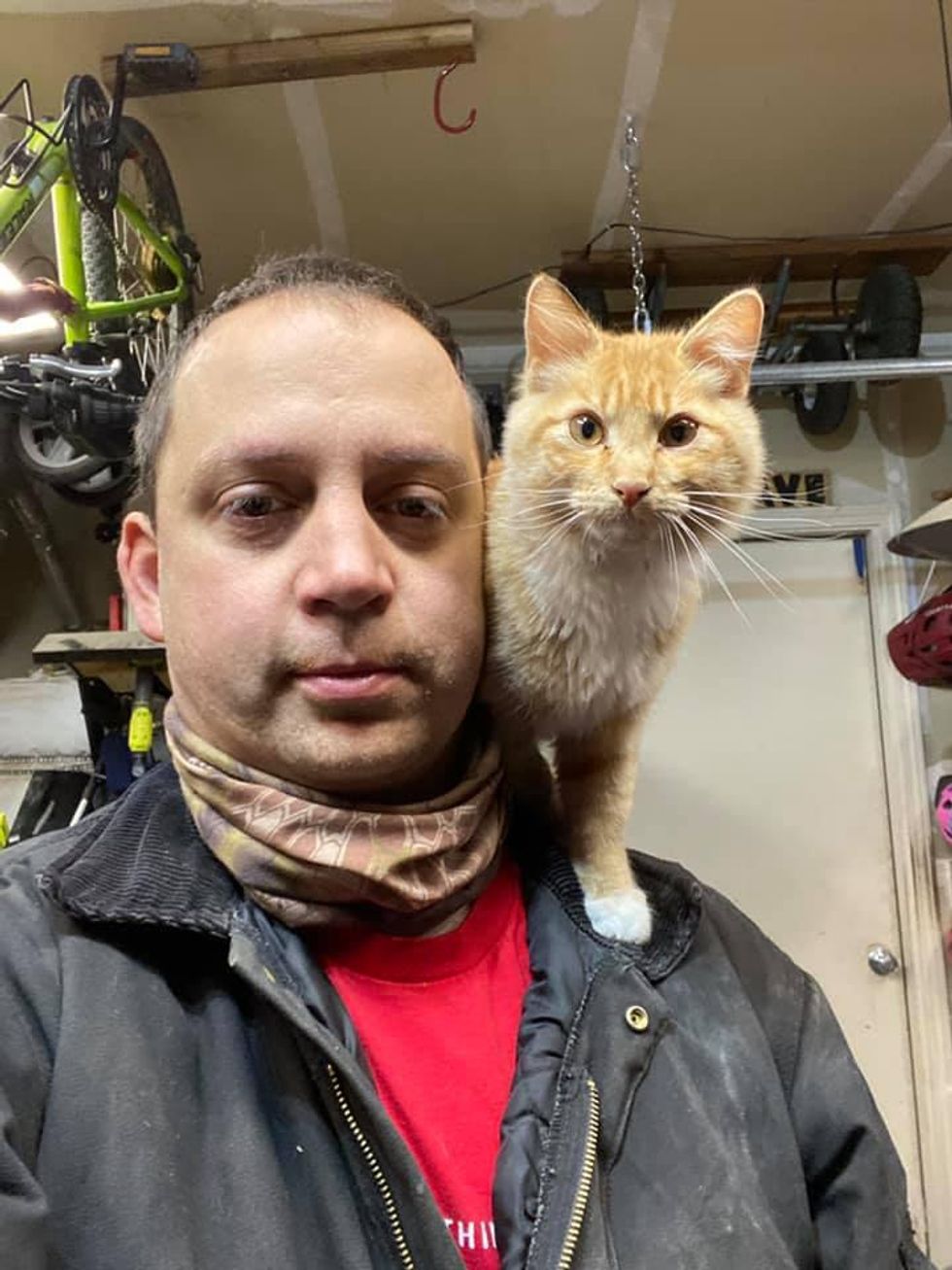 Steve had no idea where the cat had come from, but was quickly enamored by the friendly feline, who insisted on getting his attention and even climbed onto his shoulders for snuggles.