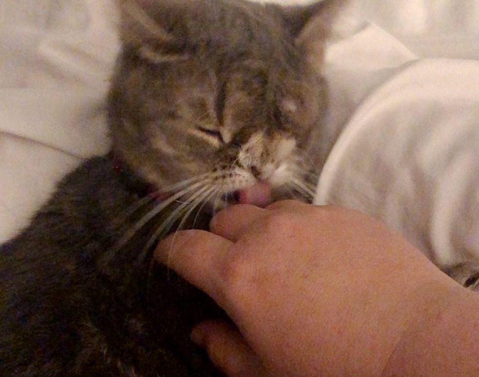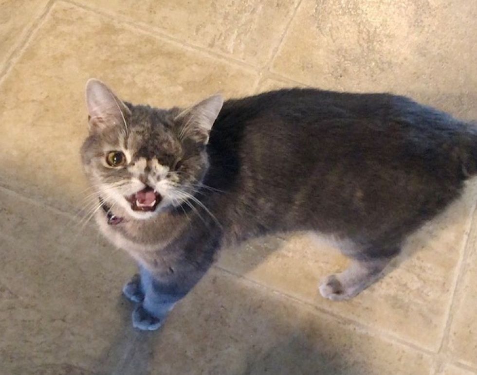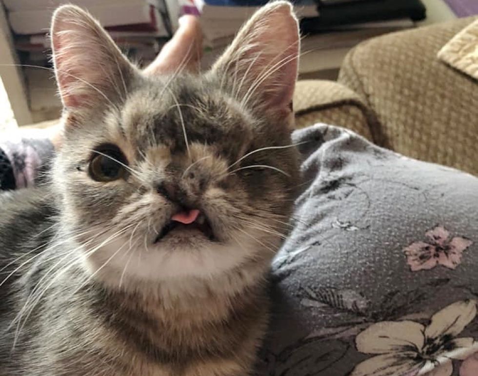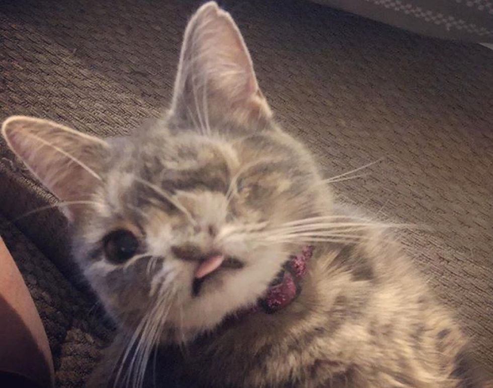 An 8-month-old kitten was brought to Itty Bitty Kitty Committee (IBKC), a rescue group in Charleston, West Virginia, for a chance at a better life. The sweet tabby was born without a left eye or nostril, and had a bobtail and asymmetrical brain.