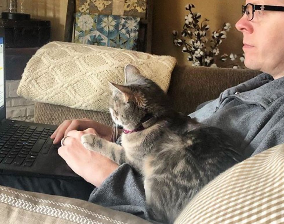 Kerry's husband quickly found himself a new best friend who insisted on keeping him company. Idgie would curl up in his arms or hop onto his lap when he sat down with a computer.