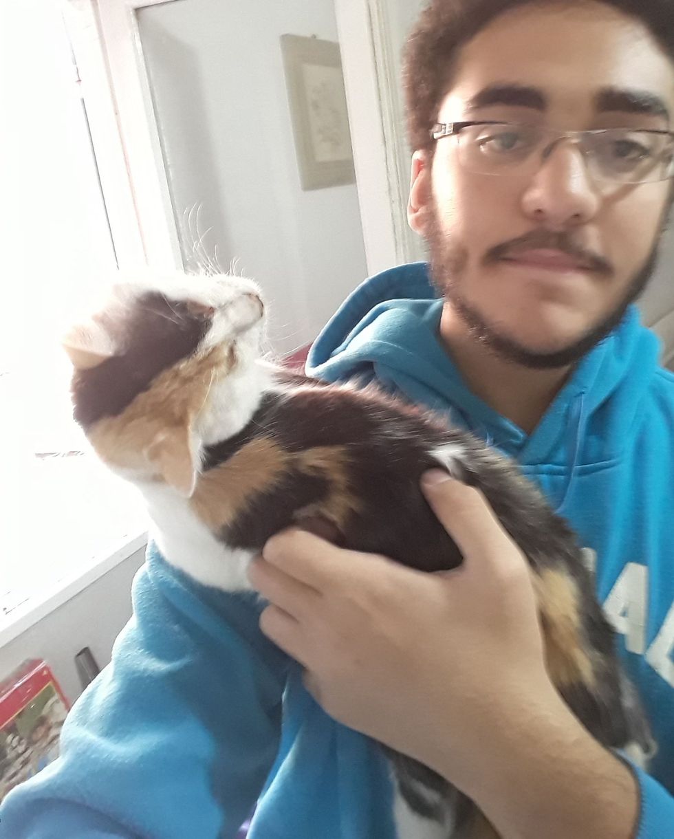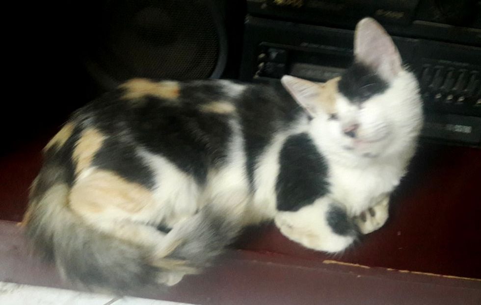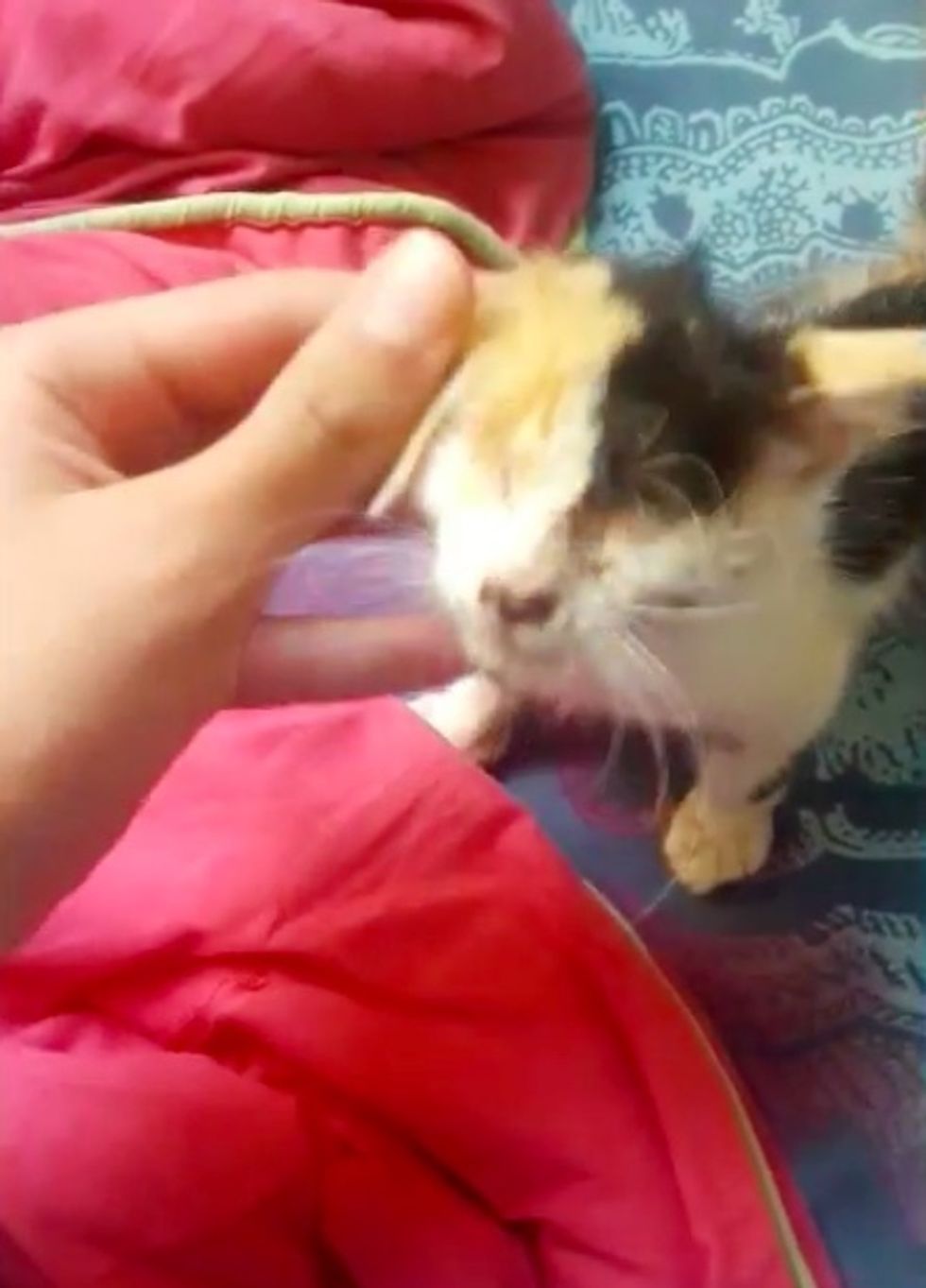 Zeyad K. (from Egypt) started feeding the tiny calico, making sure that she had something to eat every day. At the time, he wasn't able to bring in the kitten as he was living with five other family members.