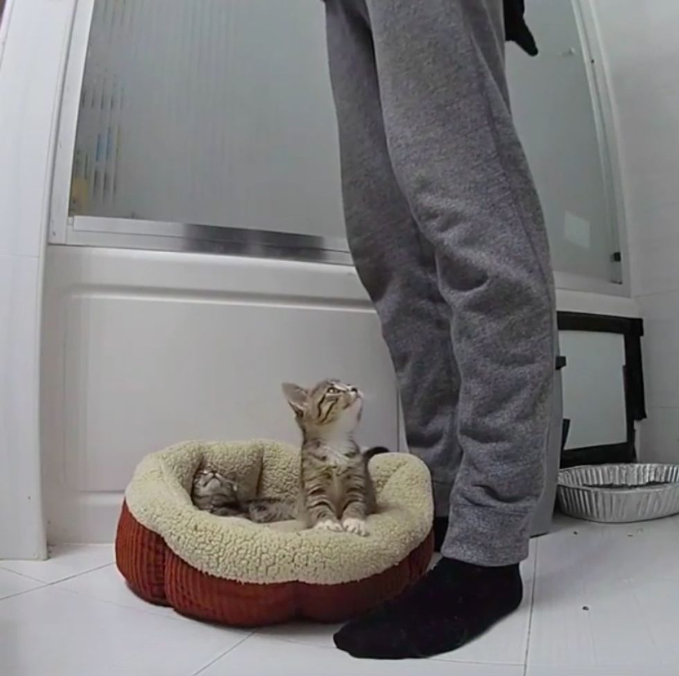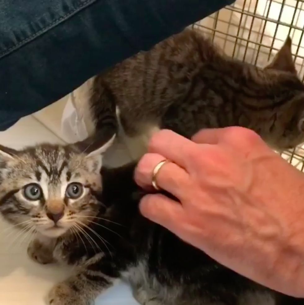 After they brought in the kitten, the crying kept going. Will went back to the same location and found another kitten hiding behind a fence. He looked a lot like Sonny - both tabbies and of the same age. Right away they knew that he was his brother.