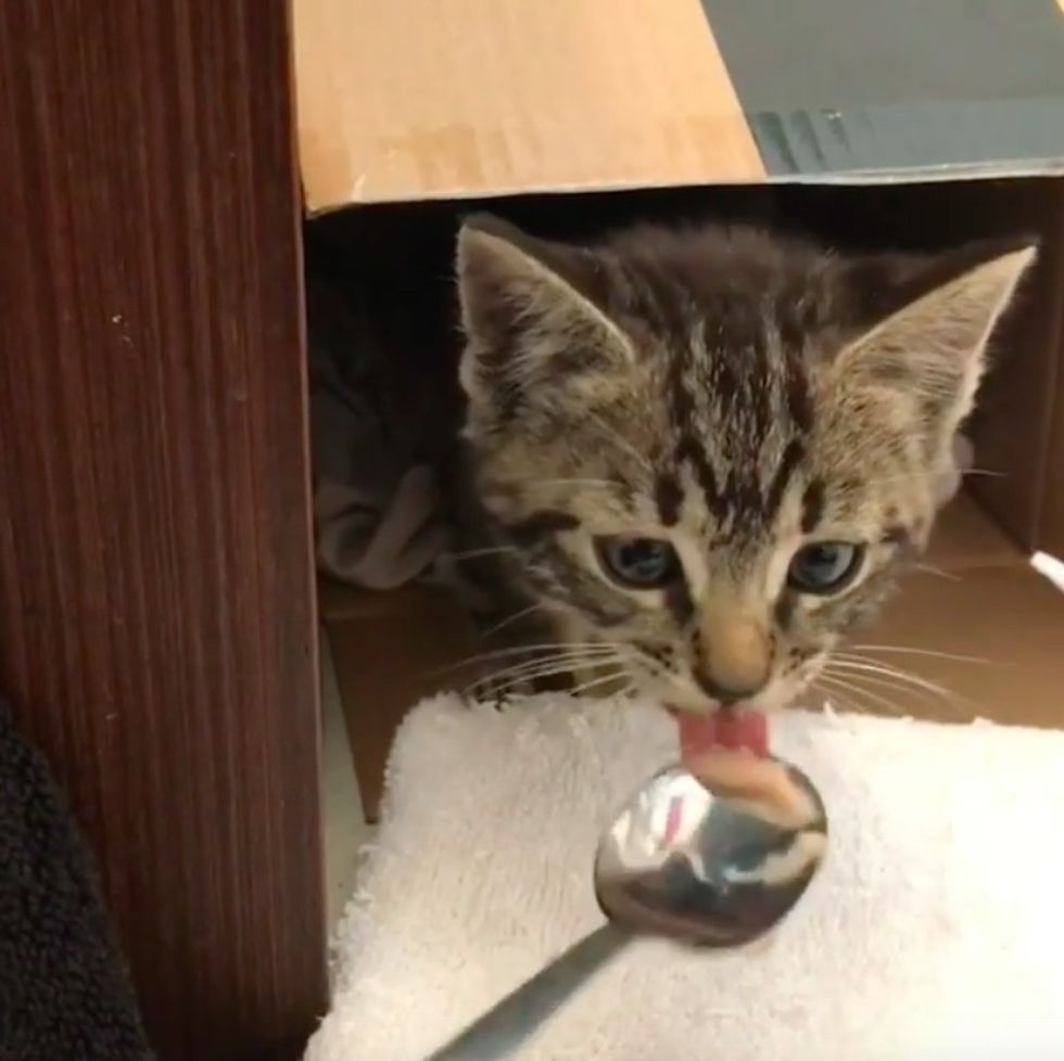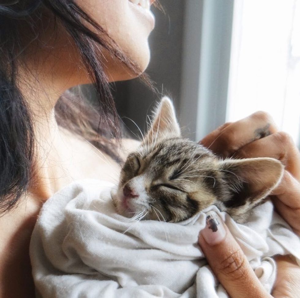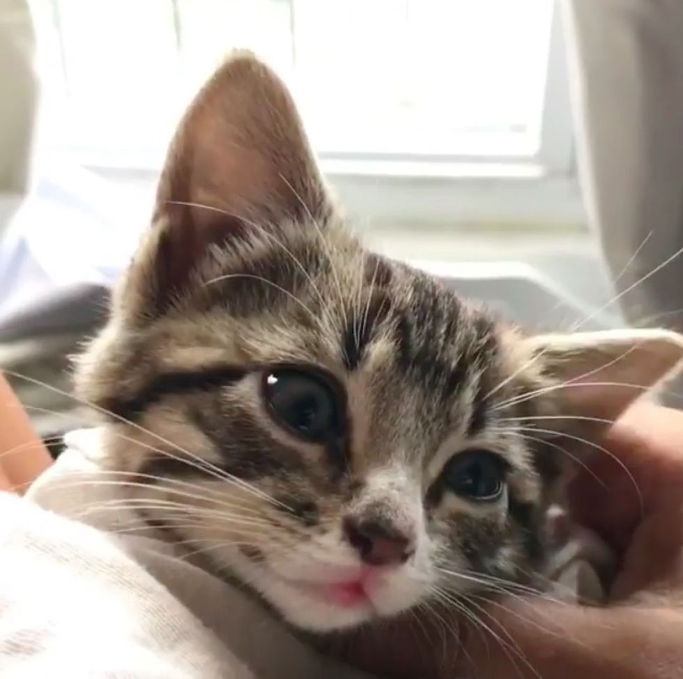 Just an hour earlier, he was crying alone behind a trash can, but now he was clean, flea-free, fed, and purring up a storm.