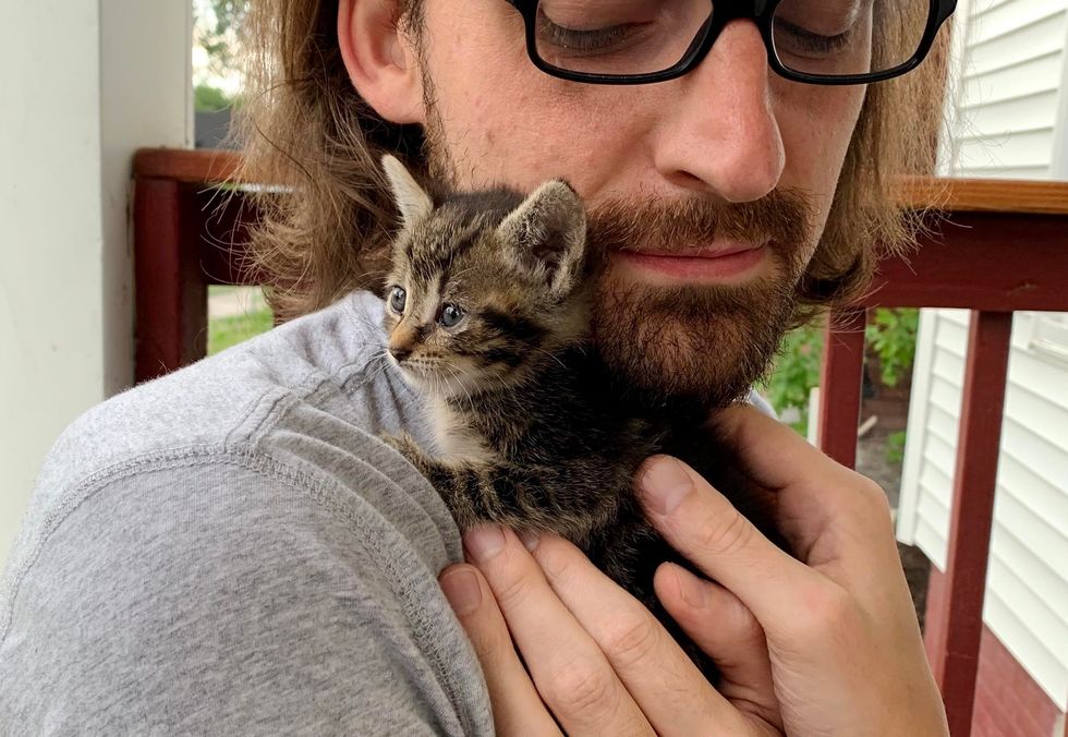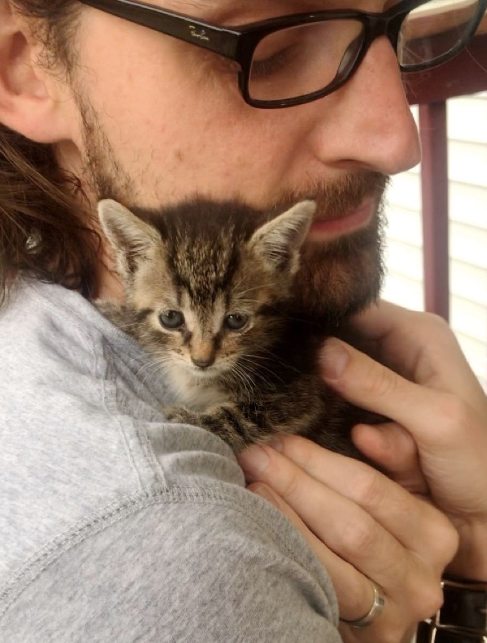 The kitten was all alone, shaking in fear but wanting attention at the same time. Stephen gently scooped her up and placed her on his shoulder for a cuddle.