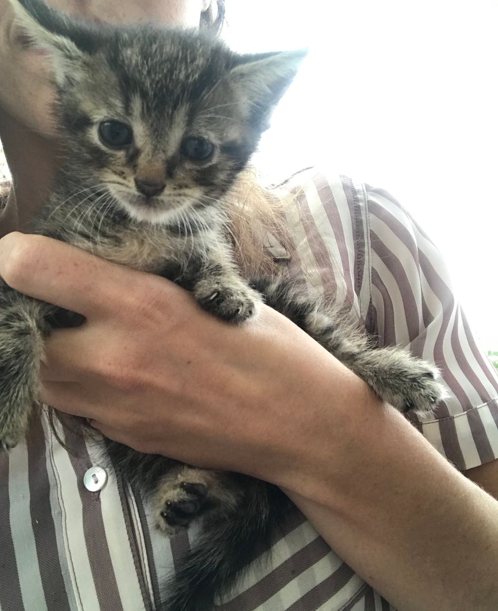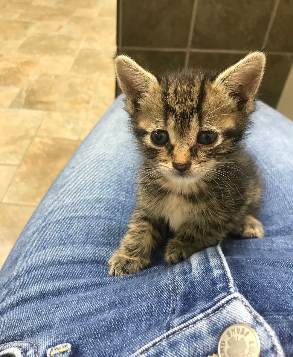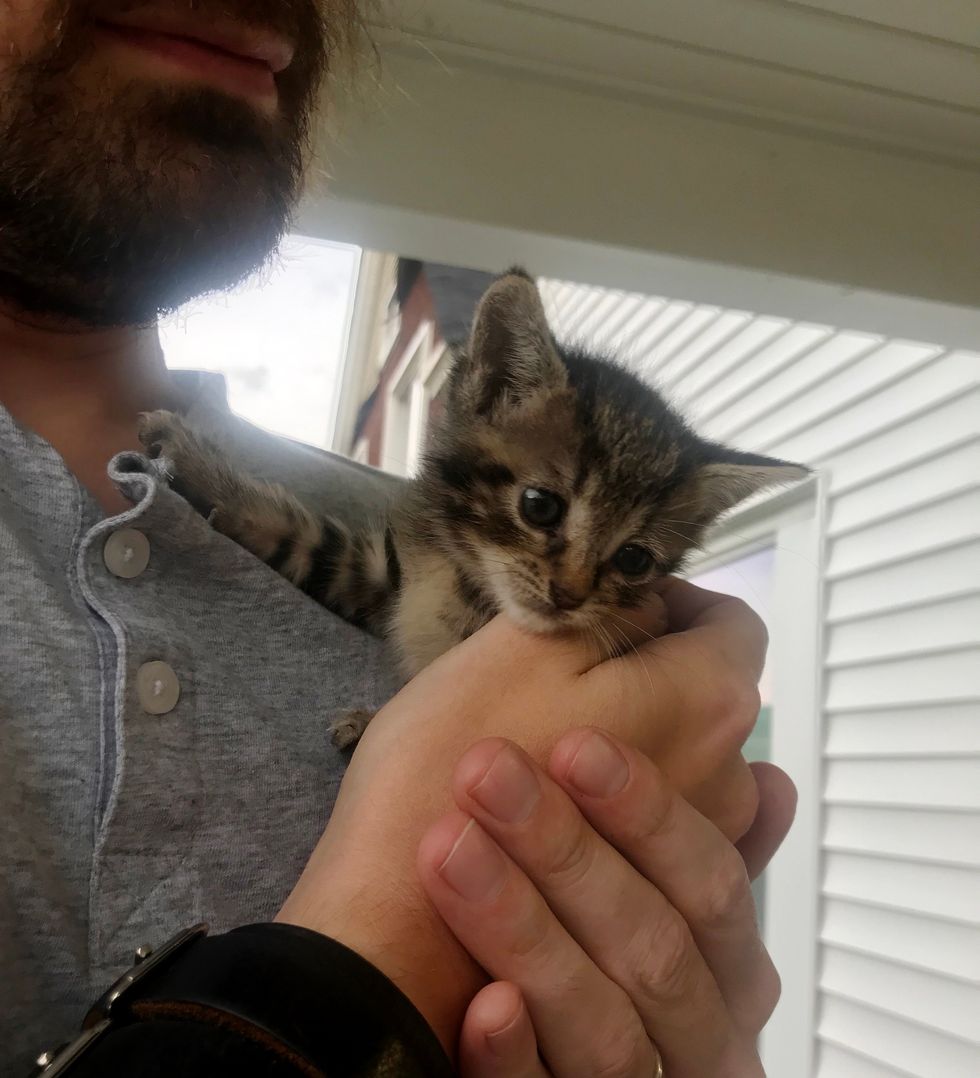 After checking around the neighborhood, they believe the kitten was most likely born to a stray cat and somehow got left behind.