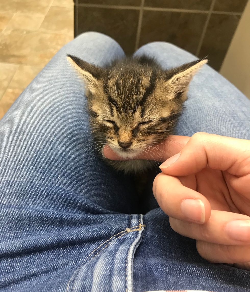 After getting a full belly, she nestled in her human's lap for some much-needed TLC. She was rumbling with her adorable little purrs while getting chin scratches.