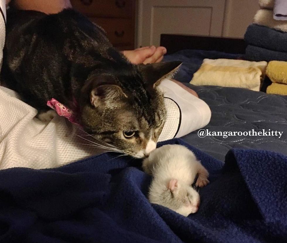 When Kanga was first introduced to little Joey, she sniffed around the tiny fur baby who was sound asleep and gave him a few gentle licks on his back.