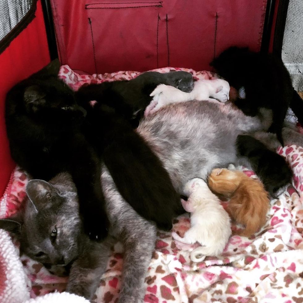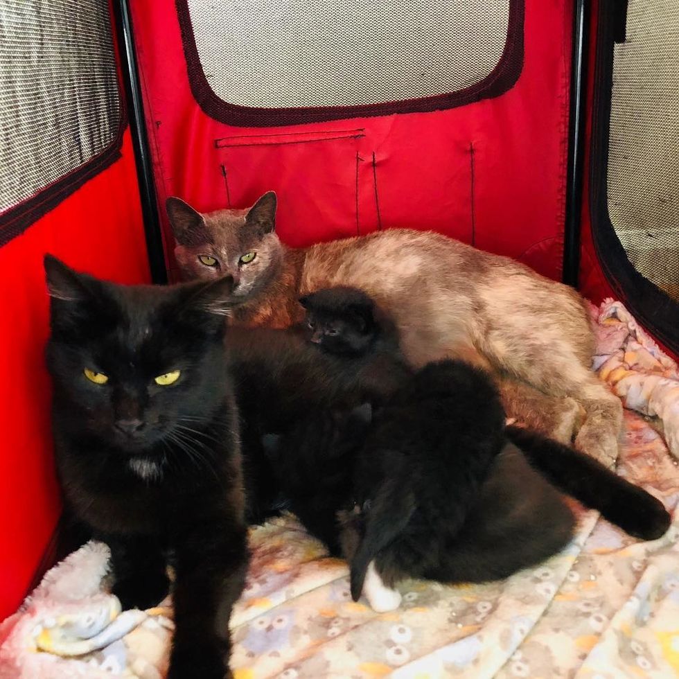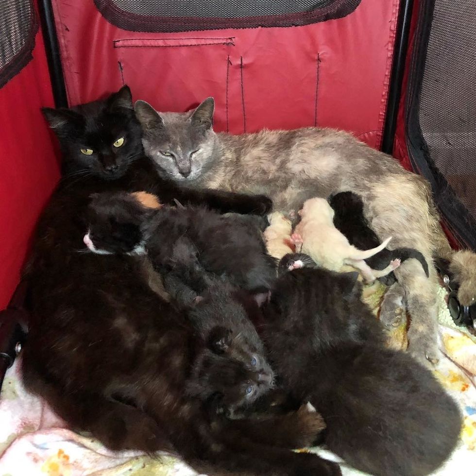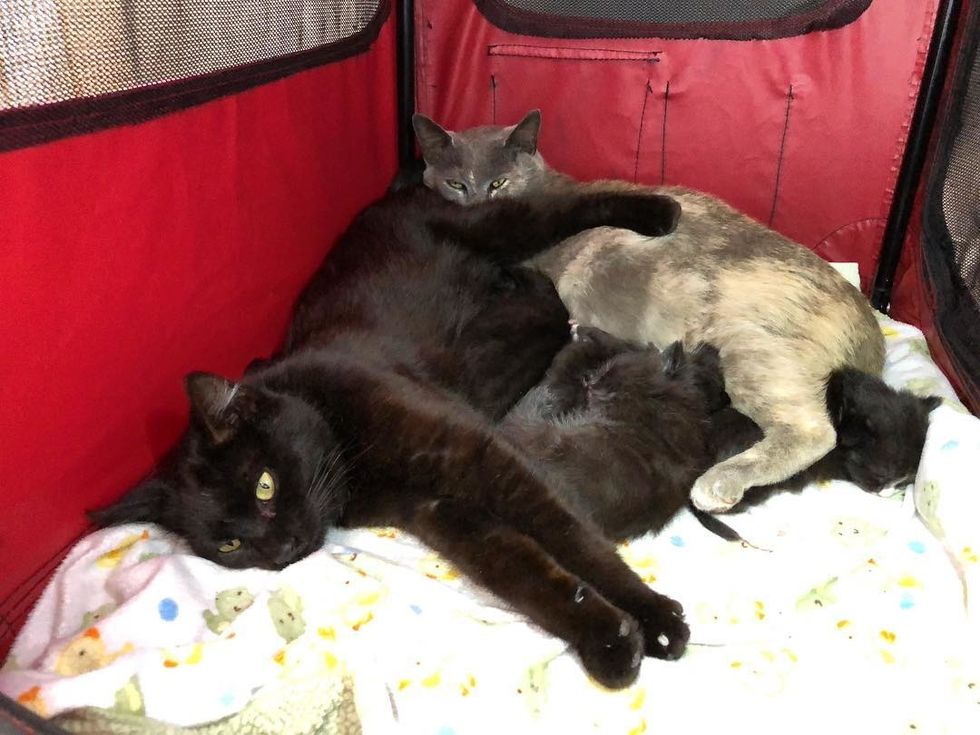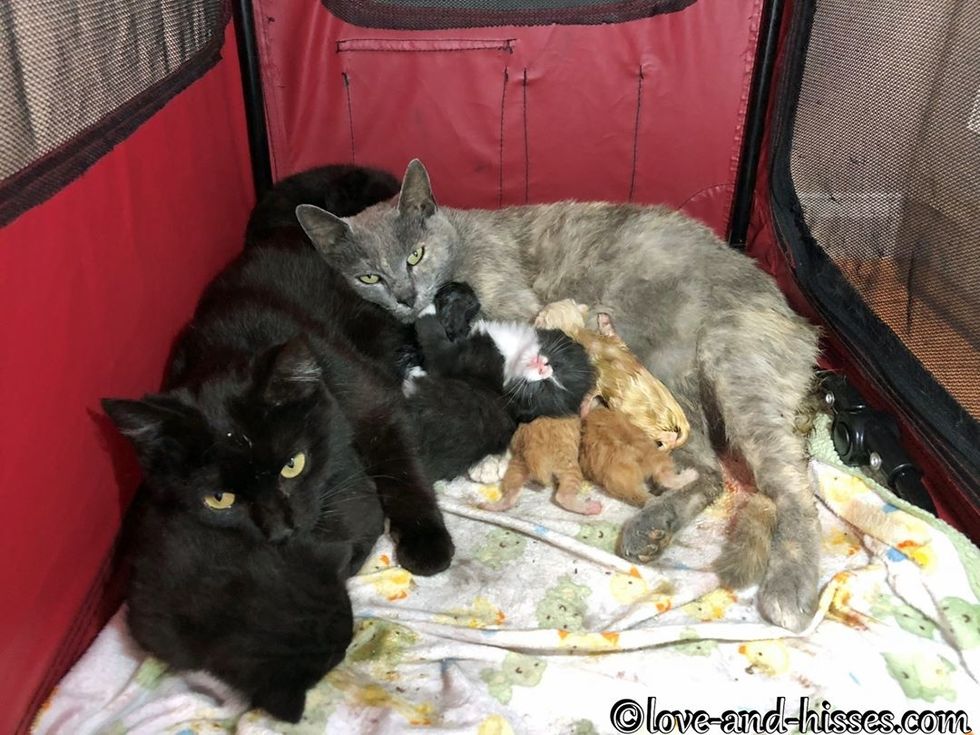 "I had assumed that Kristi would want to have her kittens in another location and then perhaps merge the two litters when they were a bit older, but she and Katia and their kittens are sharing the same crate, and it's going very well," Robyn told Love Meow.