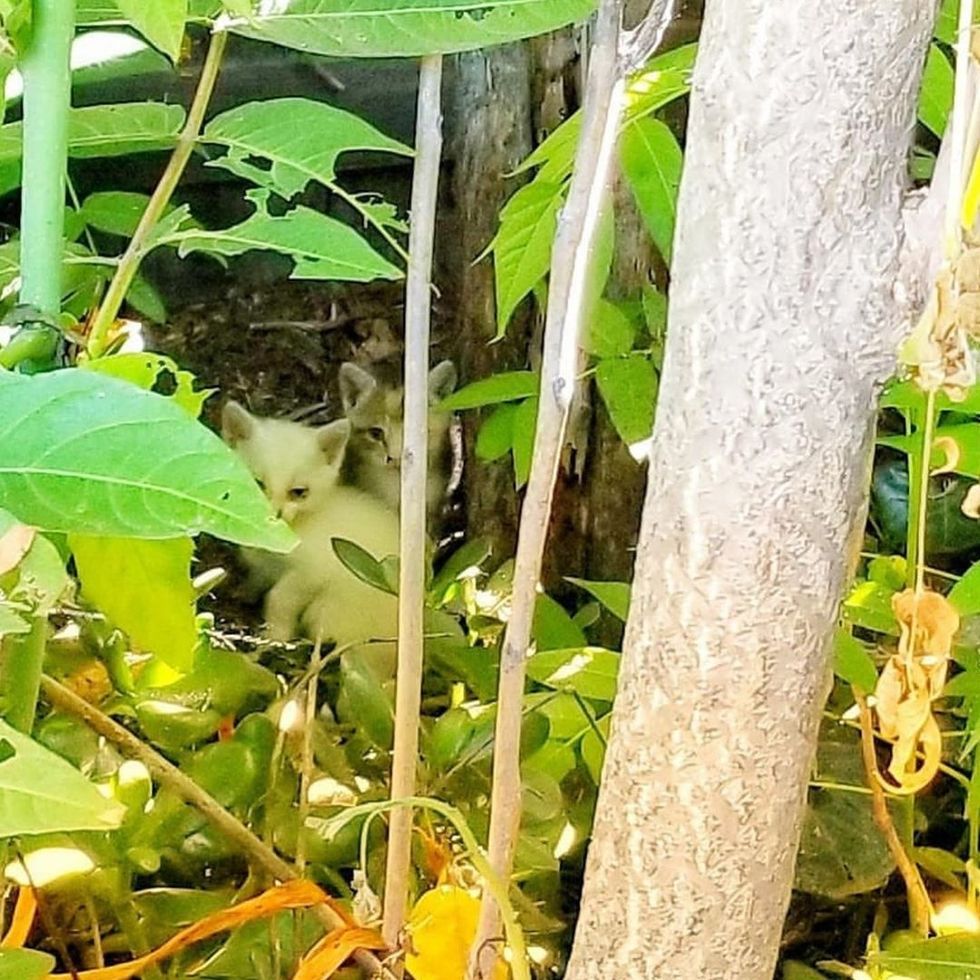 Rescuers spotted a little kitten through a hole in a fence, and found her siblings too.