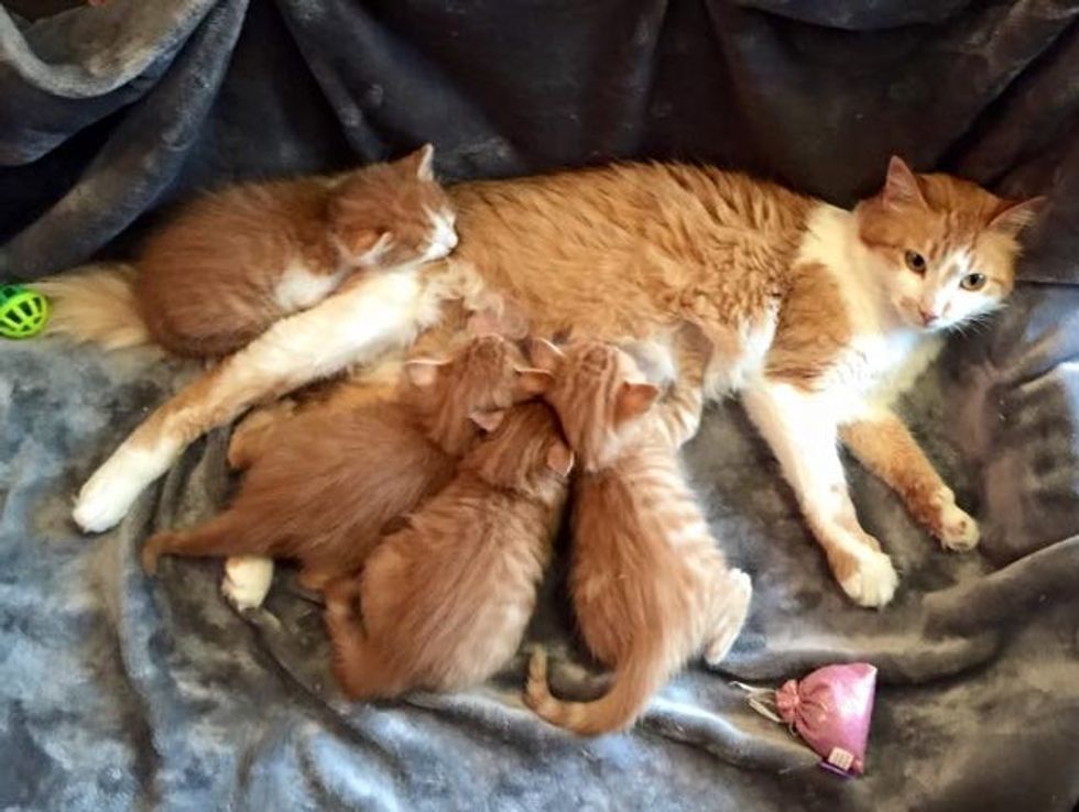 Cat mother, Frederica and her kittens Bravo, Zulu, Juliet, and India