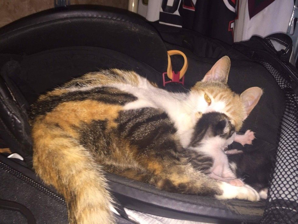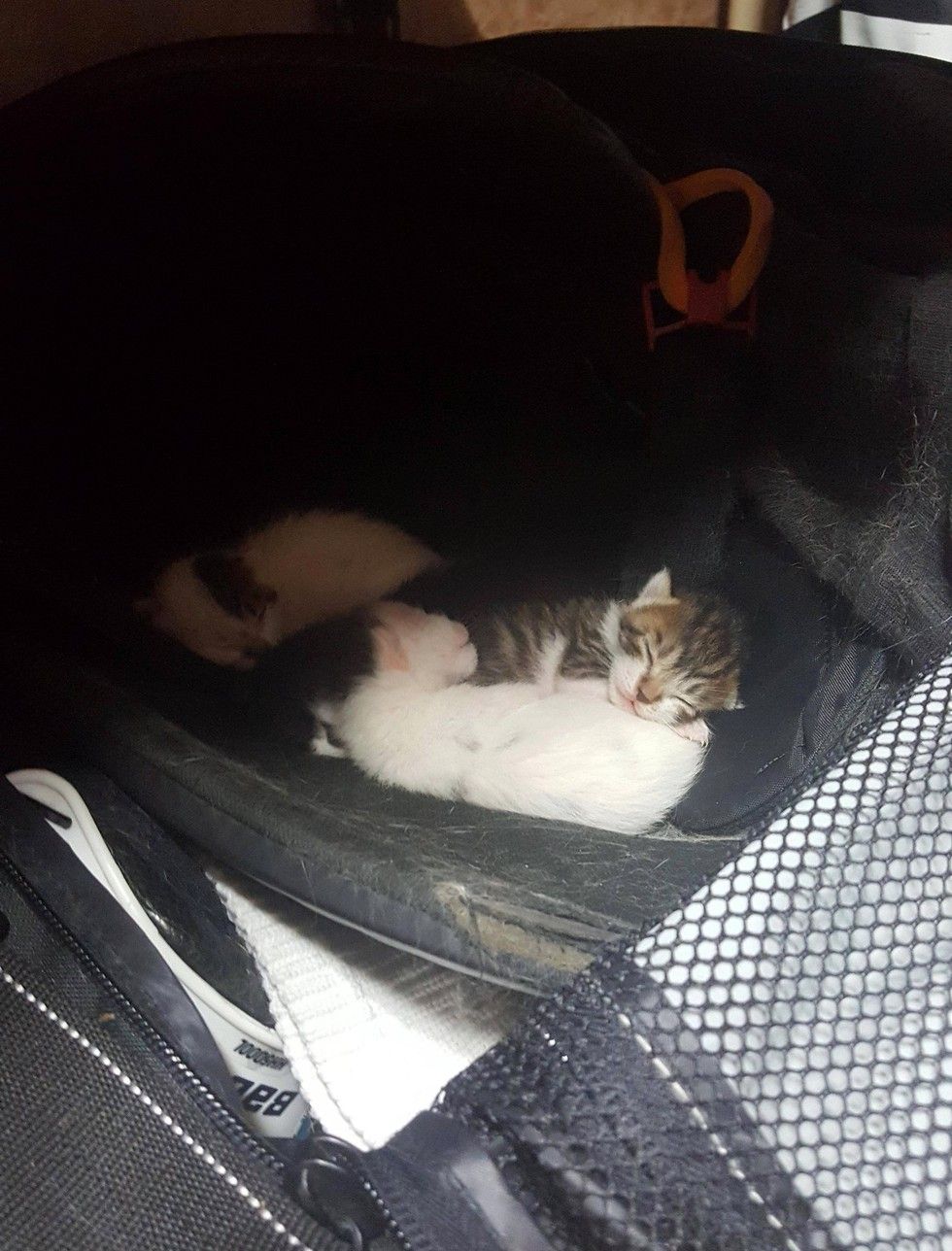 The kittens stayed in the hockey bag for a couple weeks with mama constantly looking after them and the team helping mama out with food, water and plenty of love.
