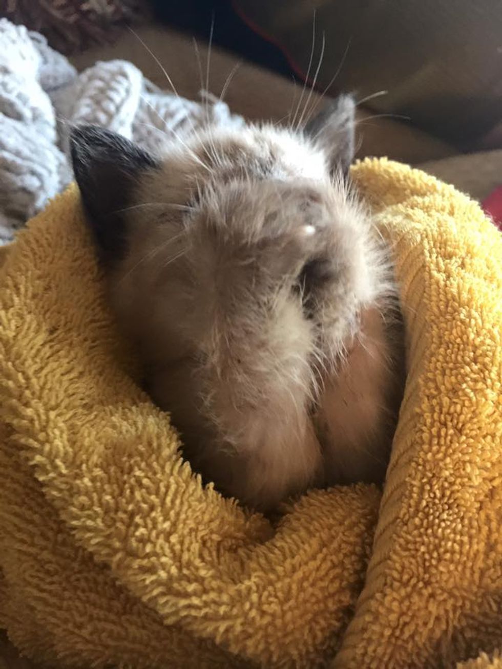 After a bath, the little kitten has already adjusted to indoor life. She is loving it!
