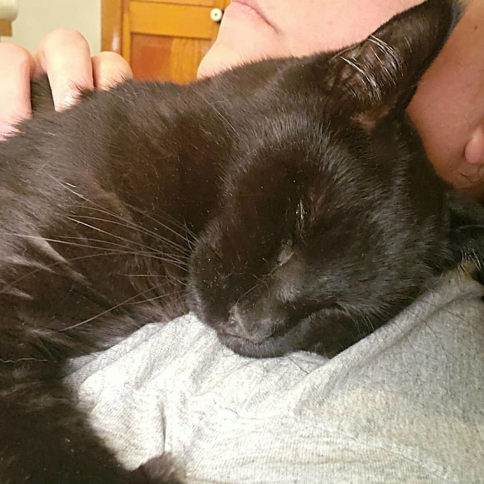Spike has gone from a terrified, hissy cat to a snuggly teddy bear, who now regularly sleeps curled up in Adrienne's arms.