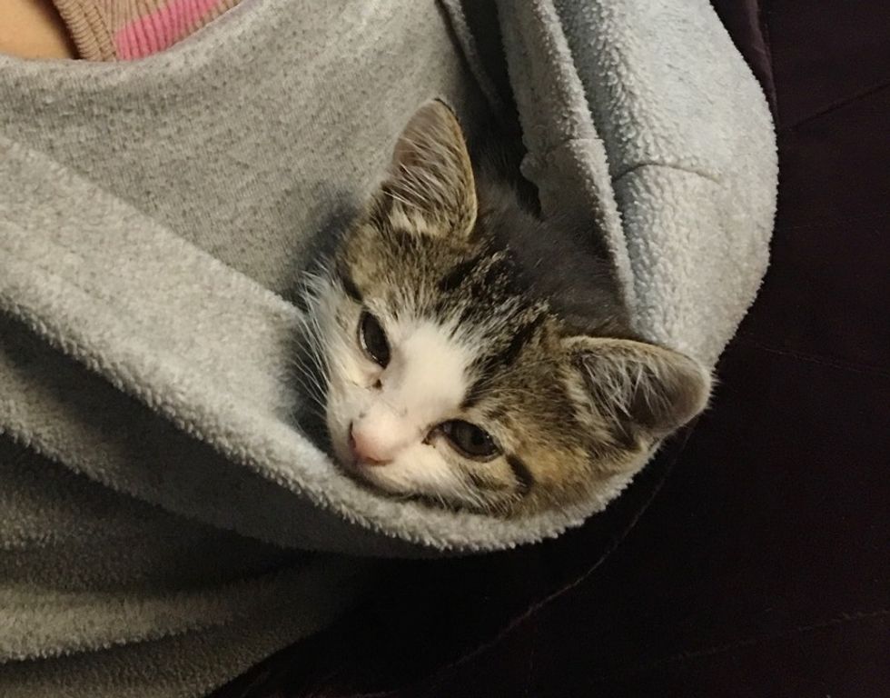 They found the kitten in the rain, kept her warm in a hoodie, and now she's family.