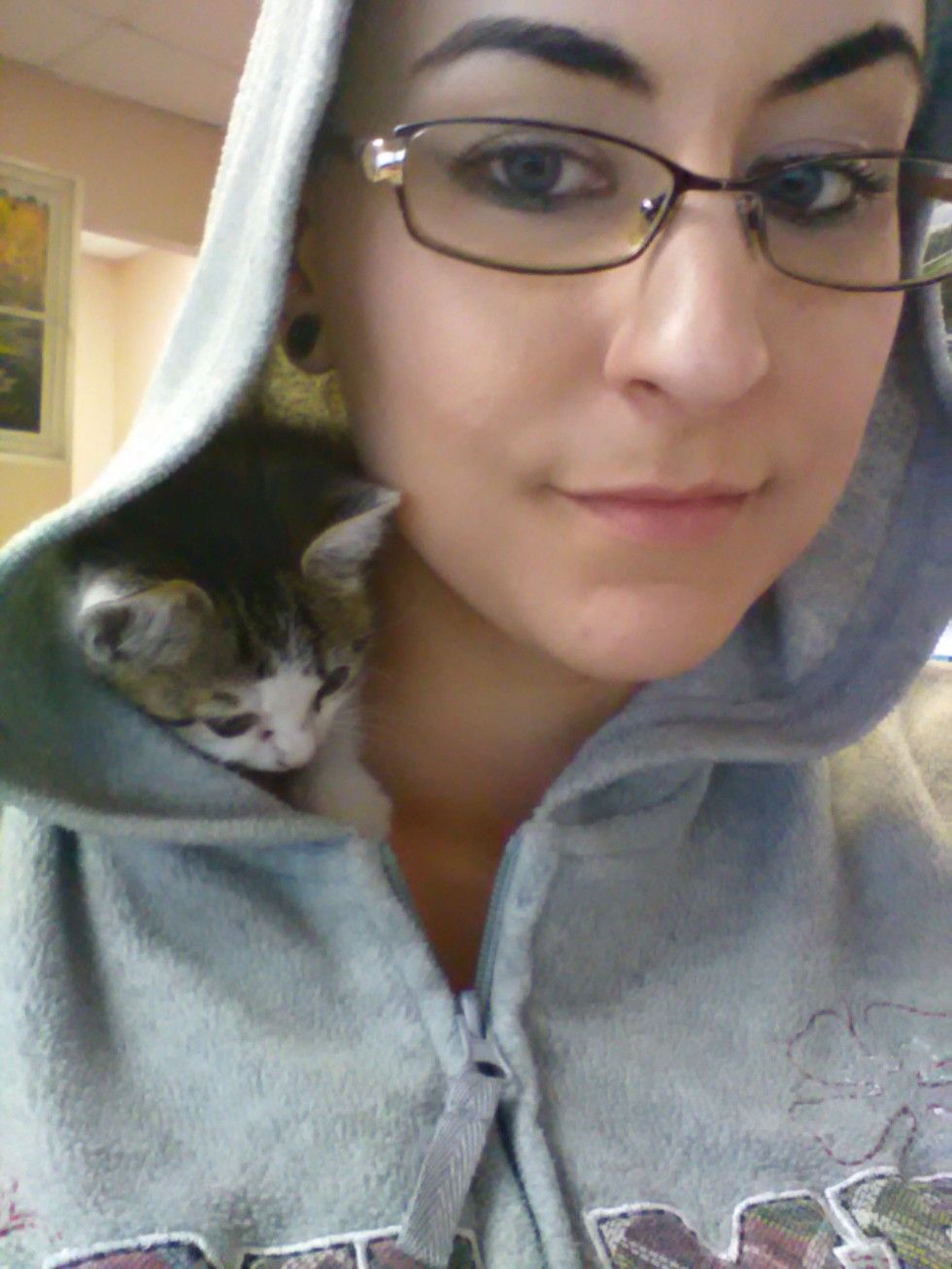 "So far her favorite spot is either in my hood or on my neck with my hood up. She likes to burrow. She's awesome."