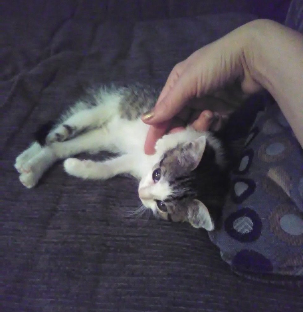 "She ate a little soft canned food and lapped a little milk replacer. She spent the night on the couch with us, trying to attack her own feet and whiskers. She purrs really hard and loves being petted on her ears.