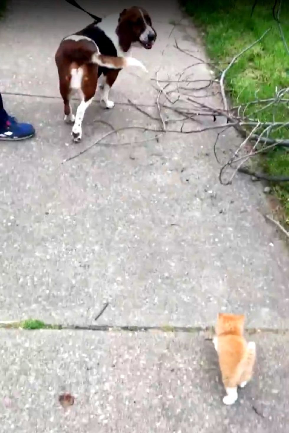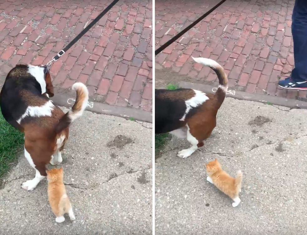 A man found a tiny stray kitten while he was walking his dog. The little fearless kitty was determined to follow them home.