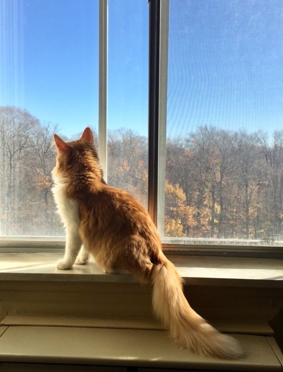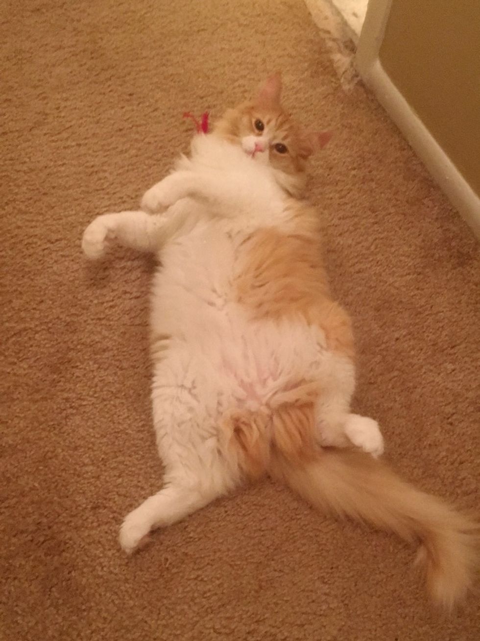 "The vet thinks he has some Main Coon in him! He still has some of his 'street smarts' and you will often find him hiding around a corner ready to pounce."