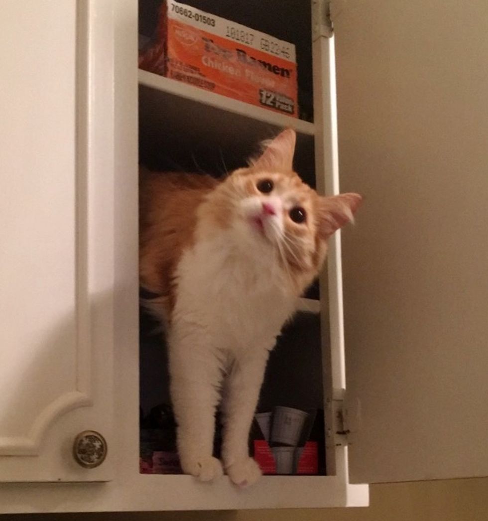 Pinot inspecting the kitchen cabinets. He is curious and very smart.