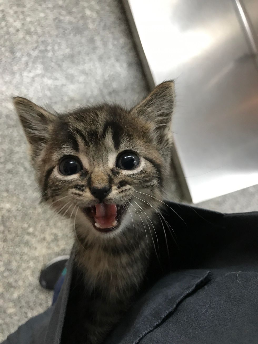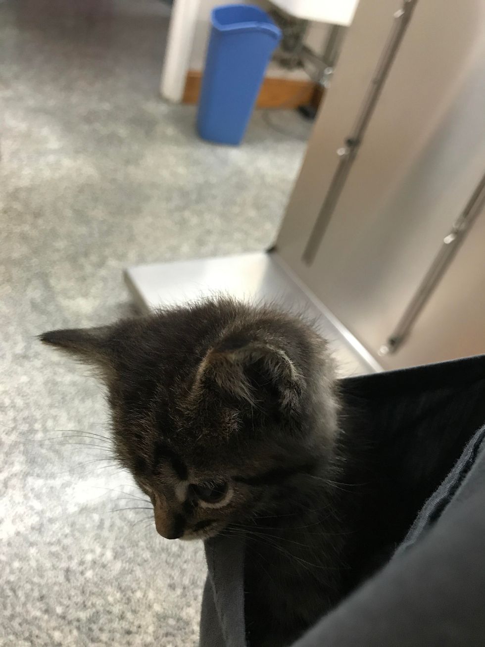 The tiniest tabby kept meowing nonstop. "He wouldn't stop crying so I put him in my scrub pocket."