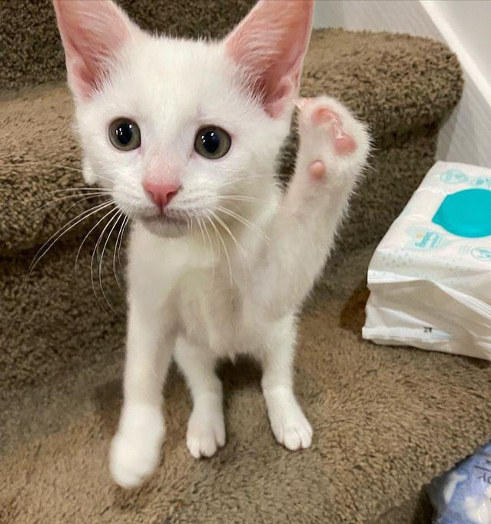 They were estimated to be three weeks old and needed round-the-clock care and medical attention — one of the white kittens had an injured paw, and the other two were wobbly.