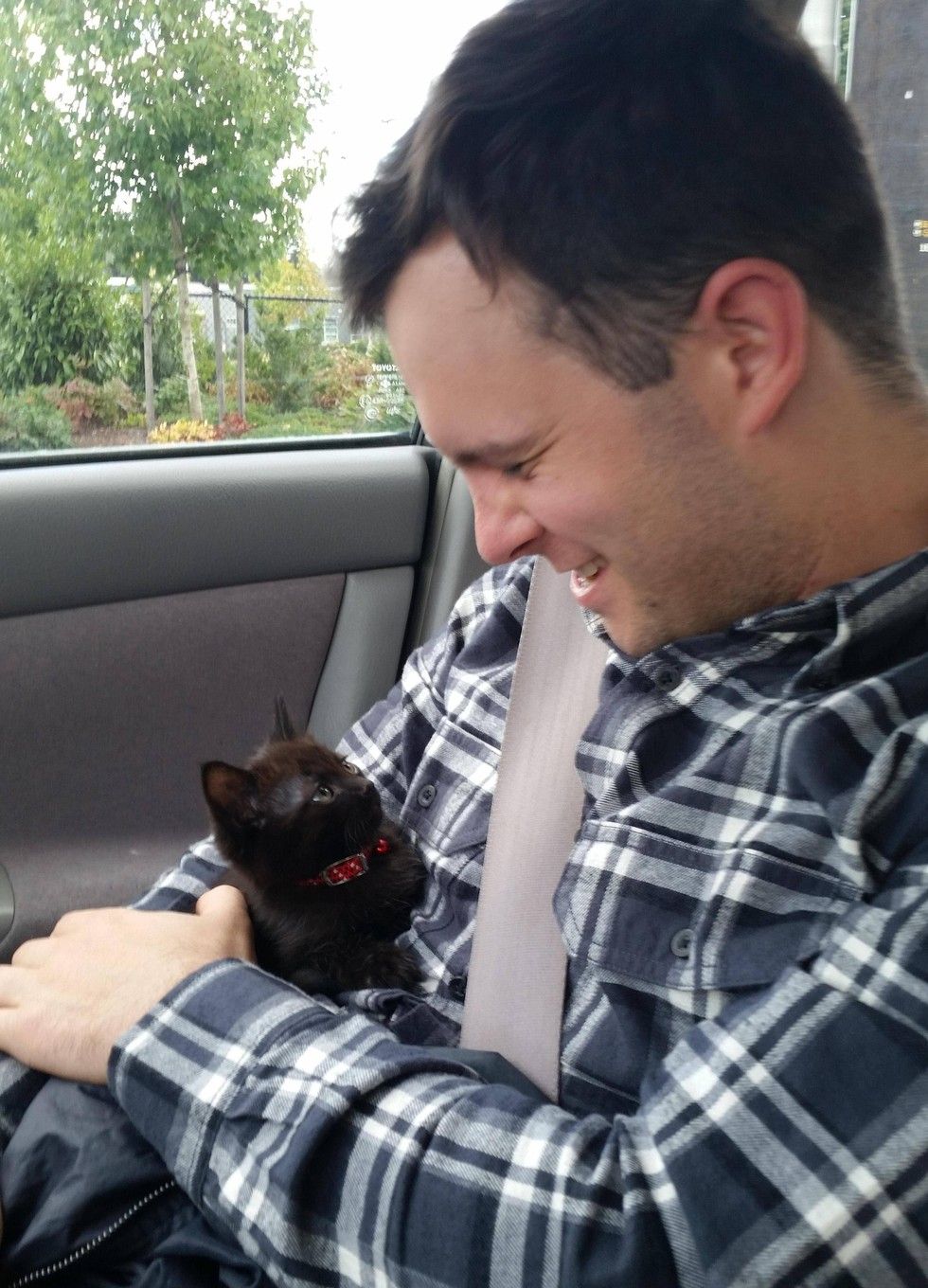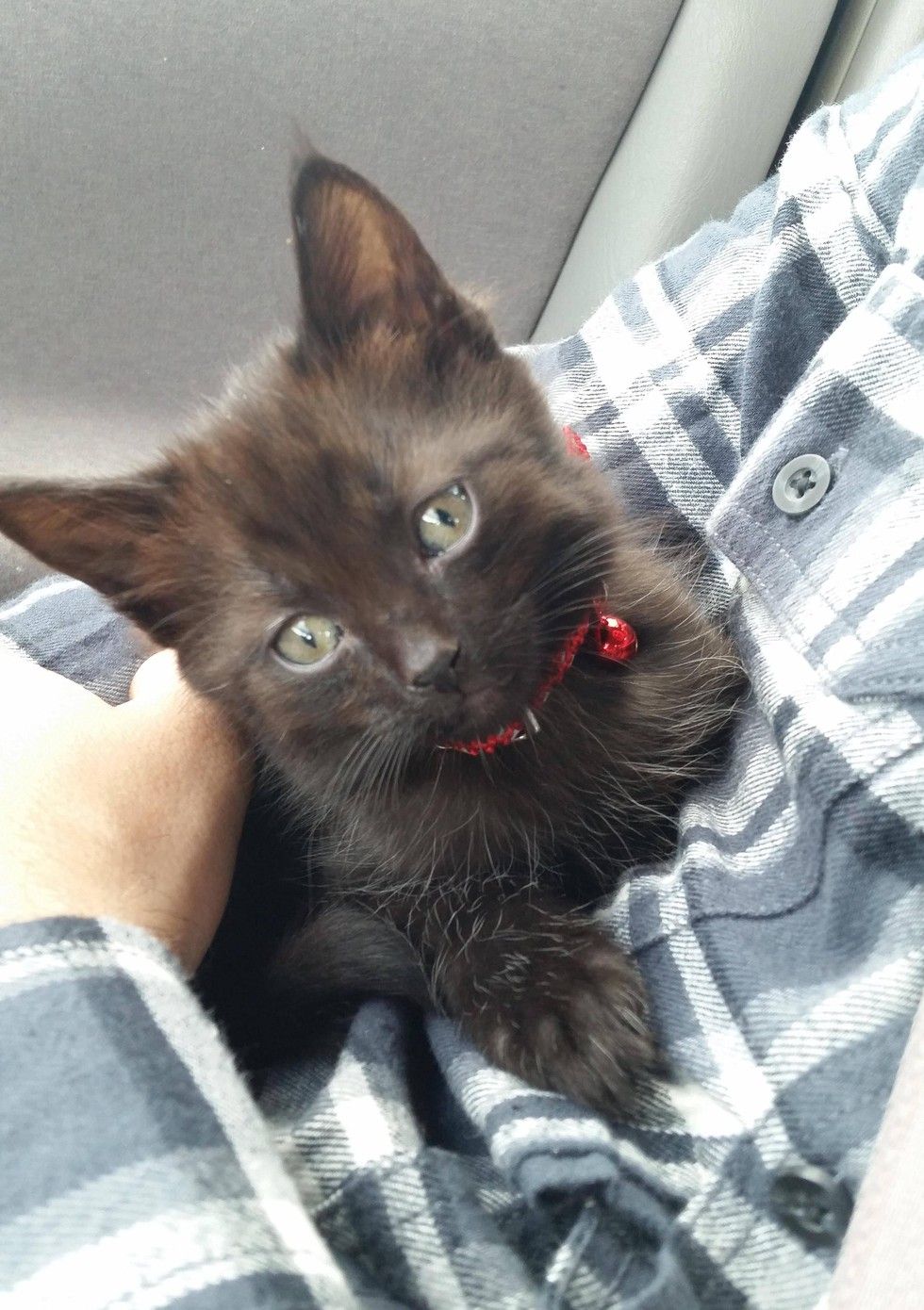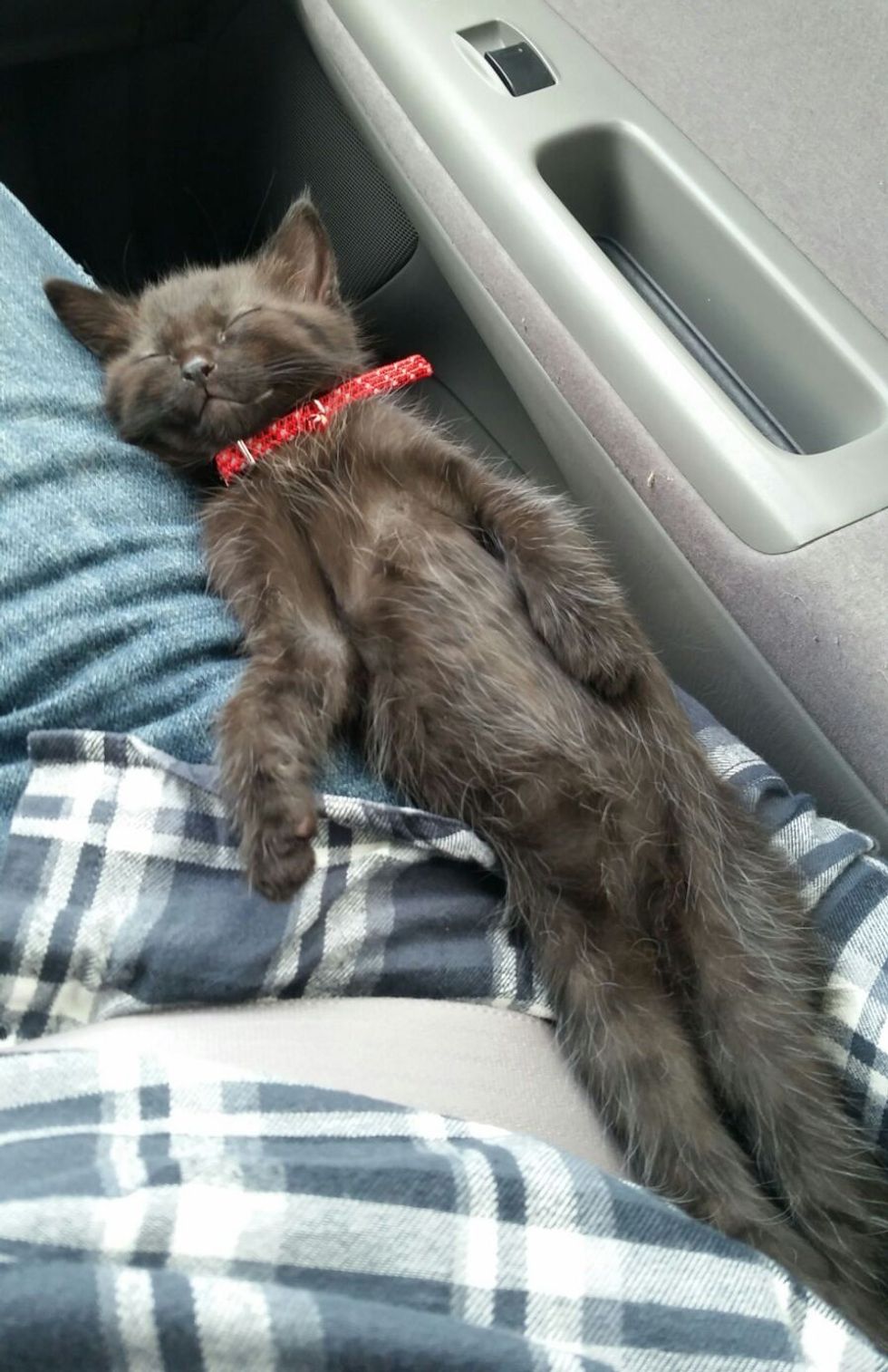 The kitten fell asleep on his human dad and napped through the whole trip to his new home.