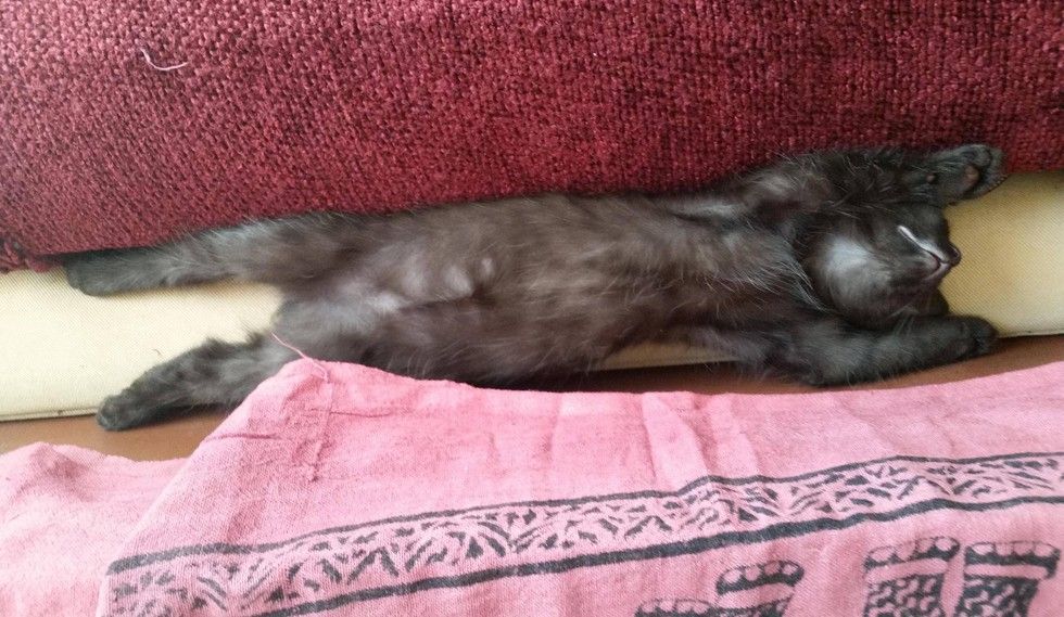 He found a perfect spot and then took a long nap with his arms stretching out.
