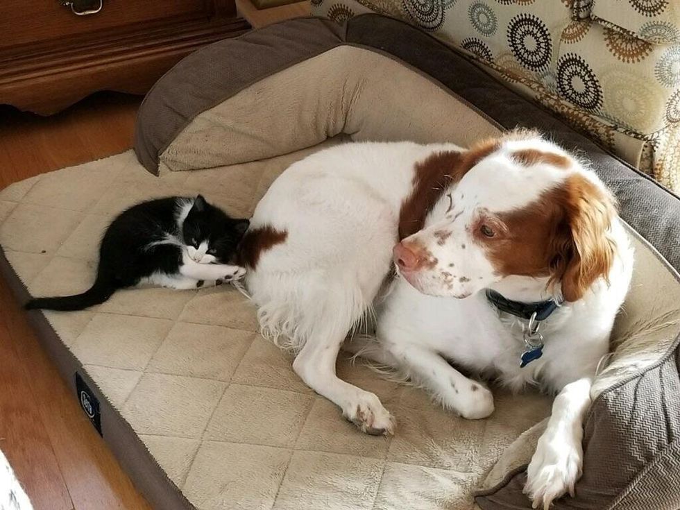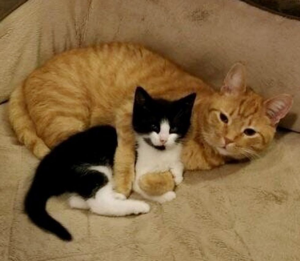 They were planning to get the rescue kitten a new home, but their cat took him into his arms and wouldn't let him go.
