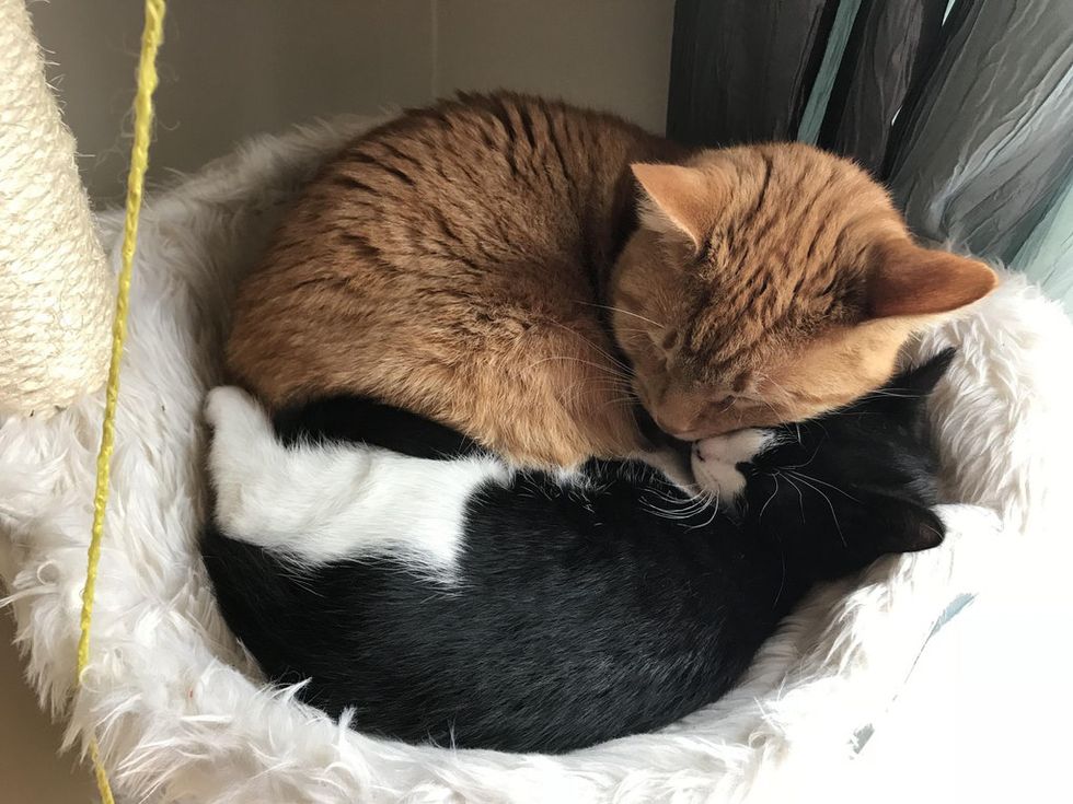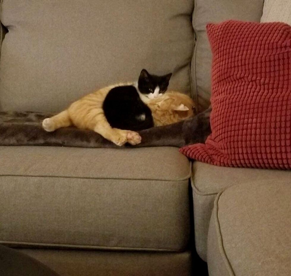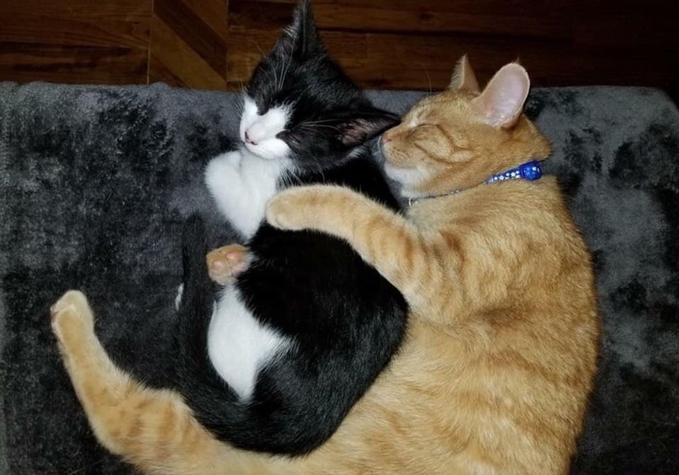 When the kitten mustered enough courage to come out and explore, their older cat took him under his wing and started giving him baths and cuddles. The two became inseparable friends.