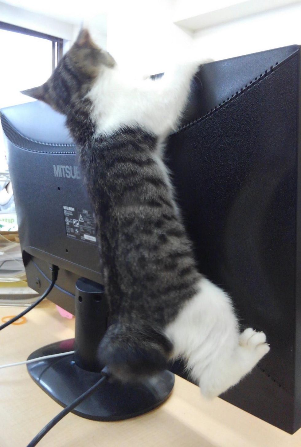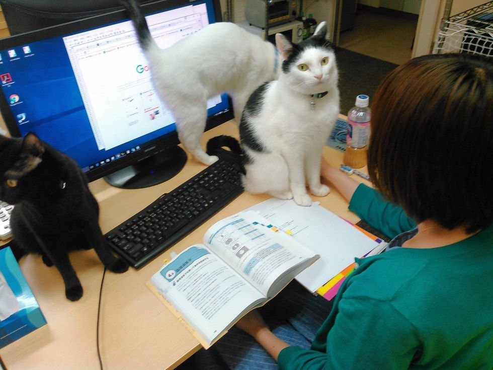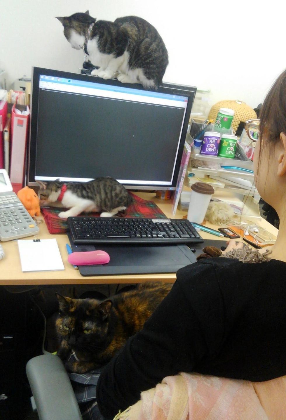 After many hours of working, the kitties remind their human friends to take a break by demanding attention and pets.