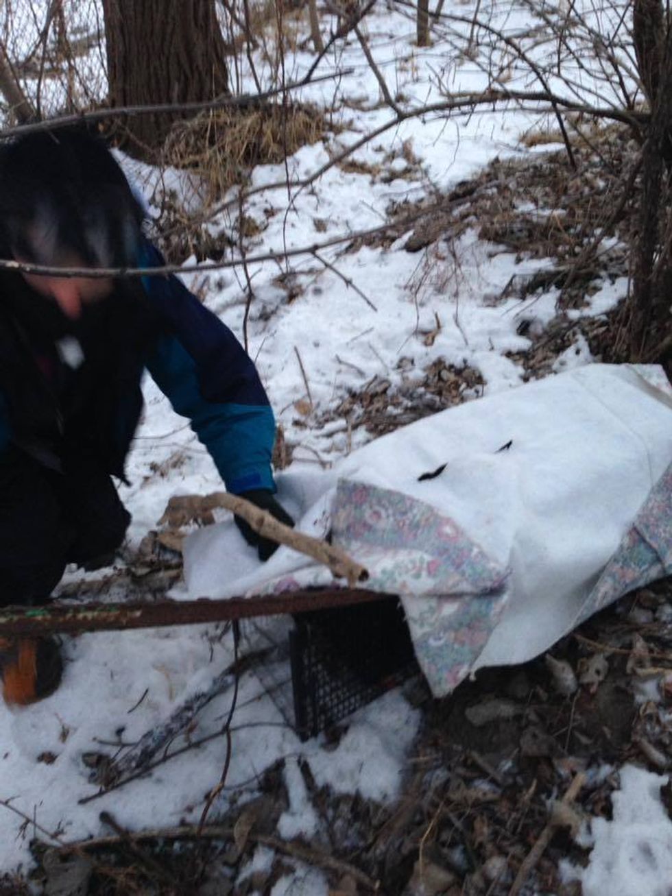 Gruber was determined to get the kitty out to a safe and warm place as the cold weather was relentless. "Three hours later, Carolyn Forinash Kirstine and I were trudging down a steep embankment setting traps."