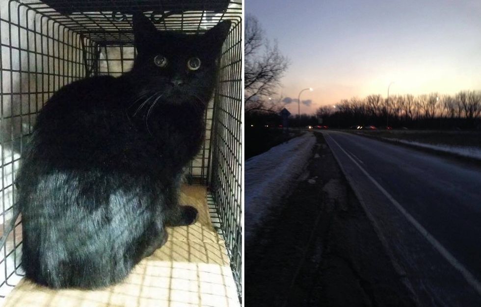 It was two degrees F (-17C) outside on Thursday (January 5th) in Minnesota. Char Gruber spotted the black kitty alone along the freeway covered in snow.