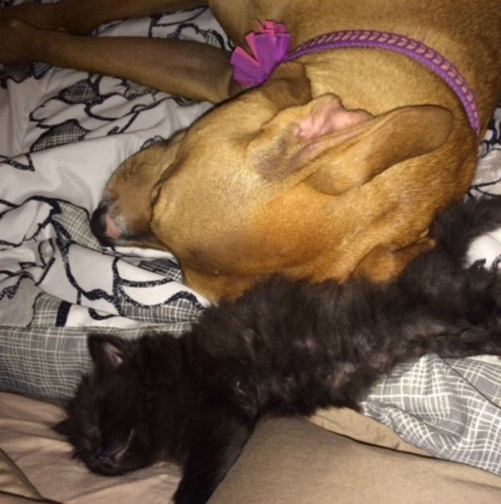 Nancy is a very sweet foster mom to her little feline baby. Tera snuggles up to her when it's time for a nap.