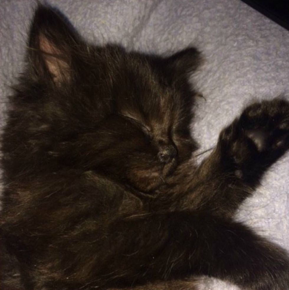 The little storm-drain kitten is now sleeping comfortably at her foster home, purring up a storm.