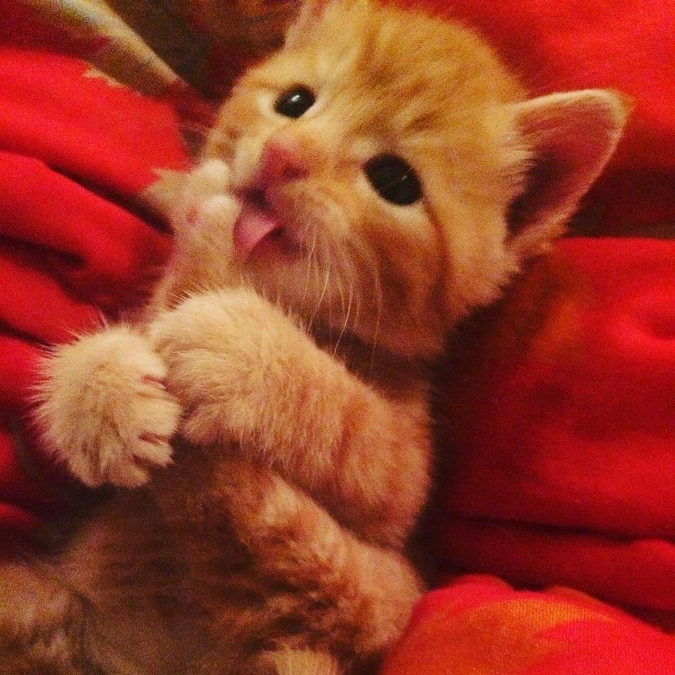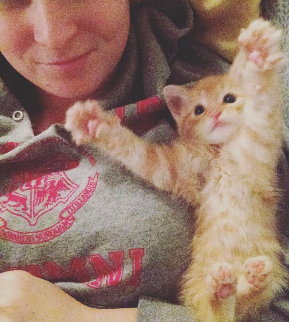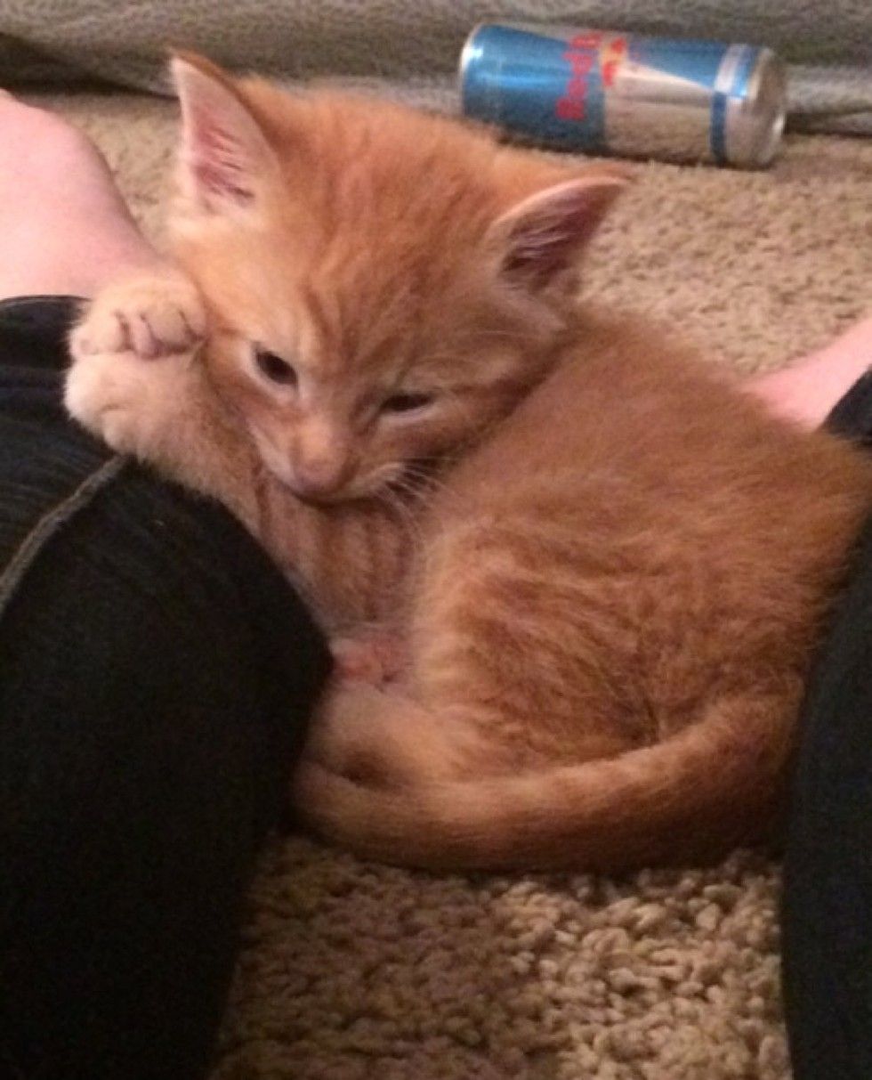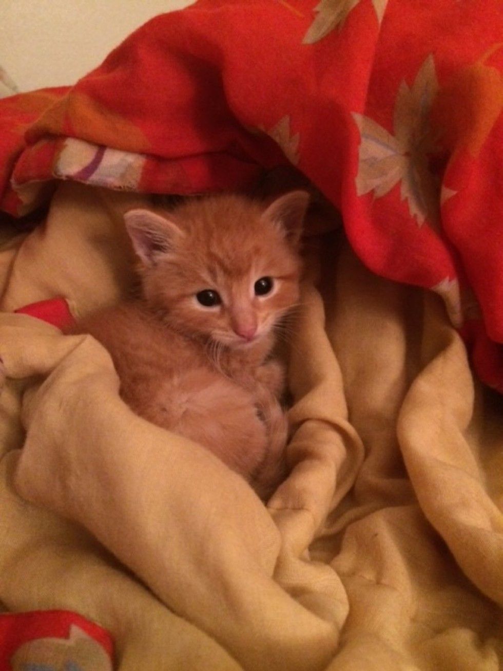 She followed the sound to the garbage container and a tiny ginger ball of fur jumped out of a pile of trash onto the ground. There was no way she would leave the kitten there to fend for himself, so off she went with the kitten in her arms.