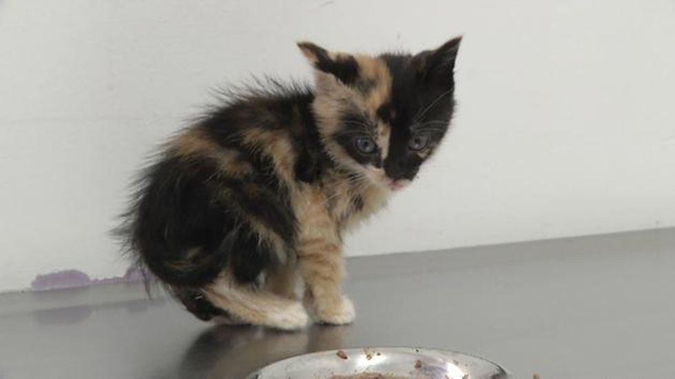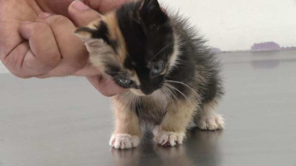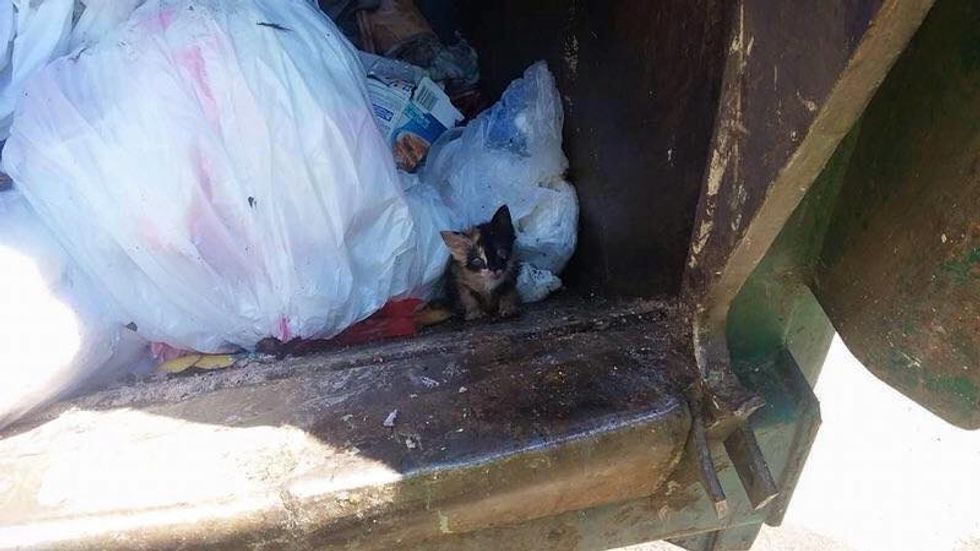 A kind-hearted man saved a tiny calico kitten out of the trash when he spotted her in the back of his truck.