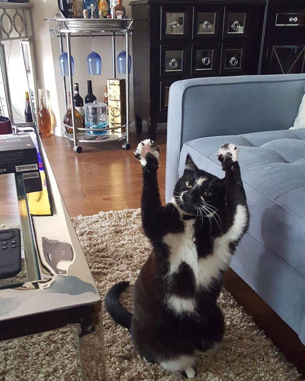 Peter noticed one morning that she tossed her paws up in the air as some sort of a stretch. He quickly grabbed the camera and captured the moment. The next day, she did it again, so Peter immediately rewarded her with her favorite treat.