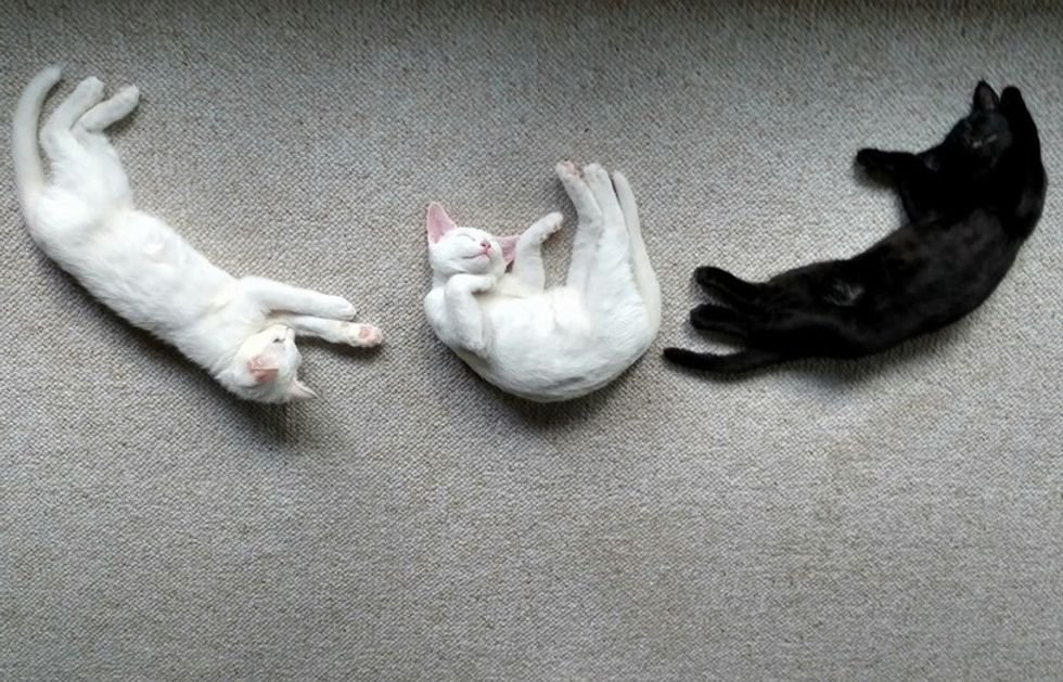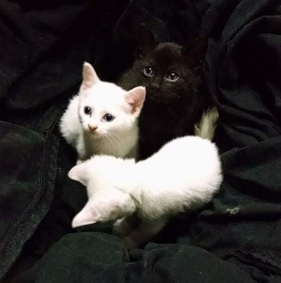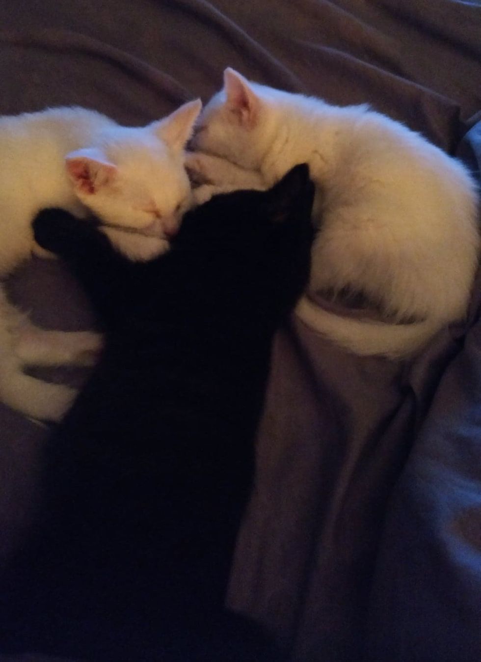 The two sisters (white kittens) are Ella and Daisy and the little boy (black kitten) is Simon.