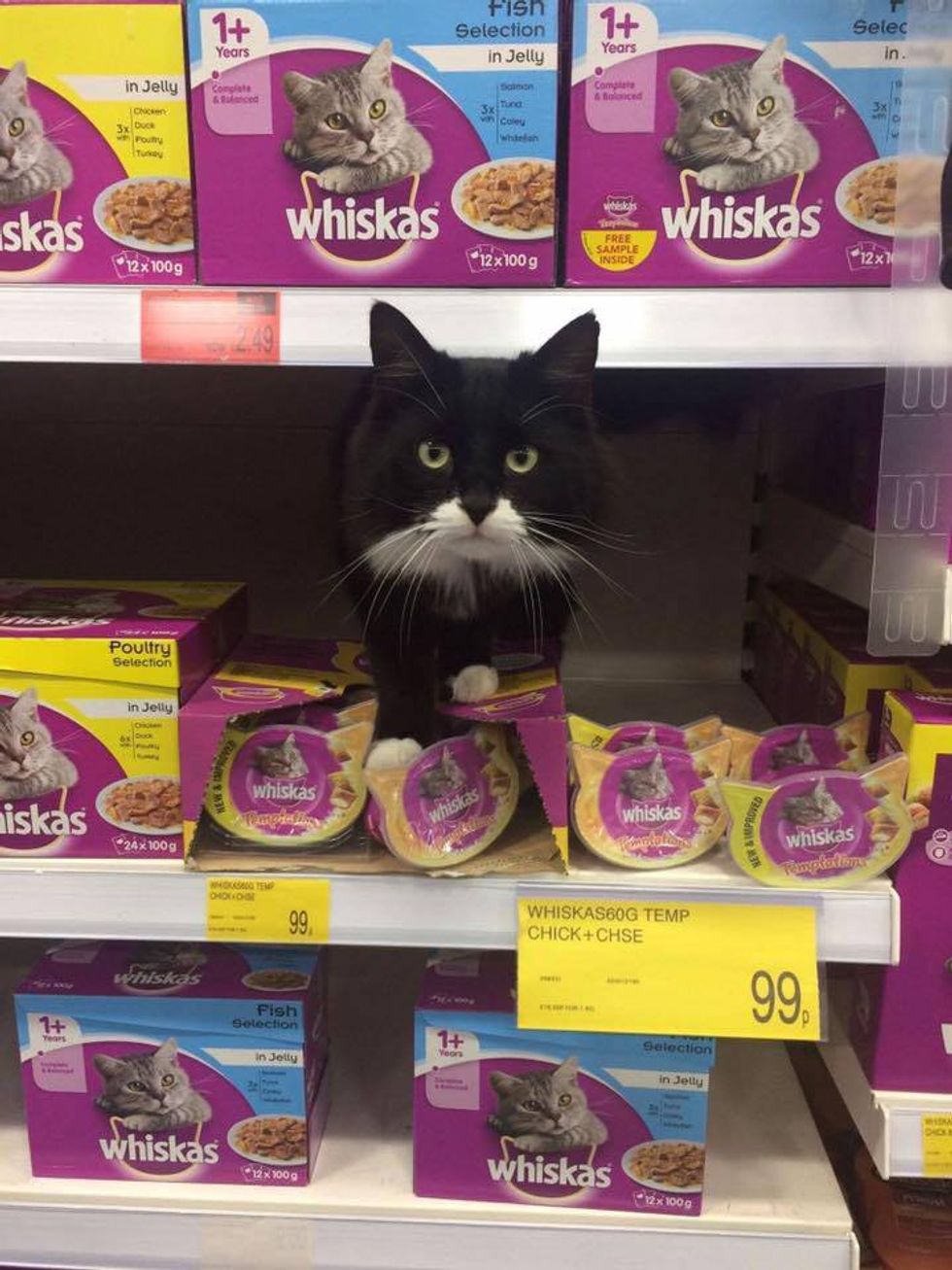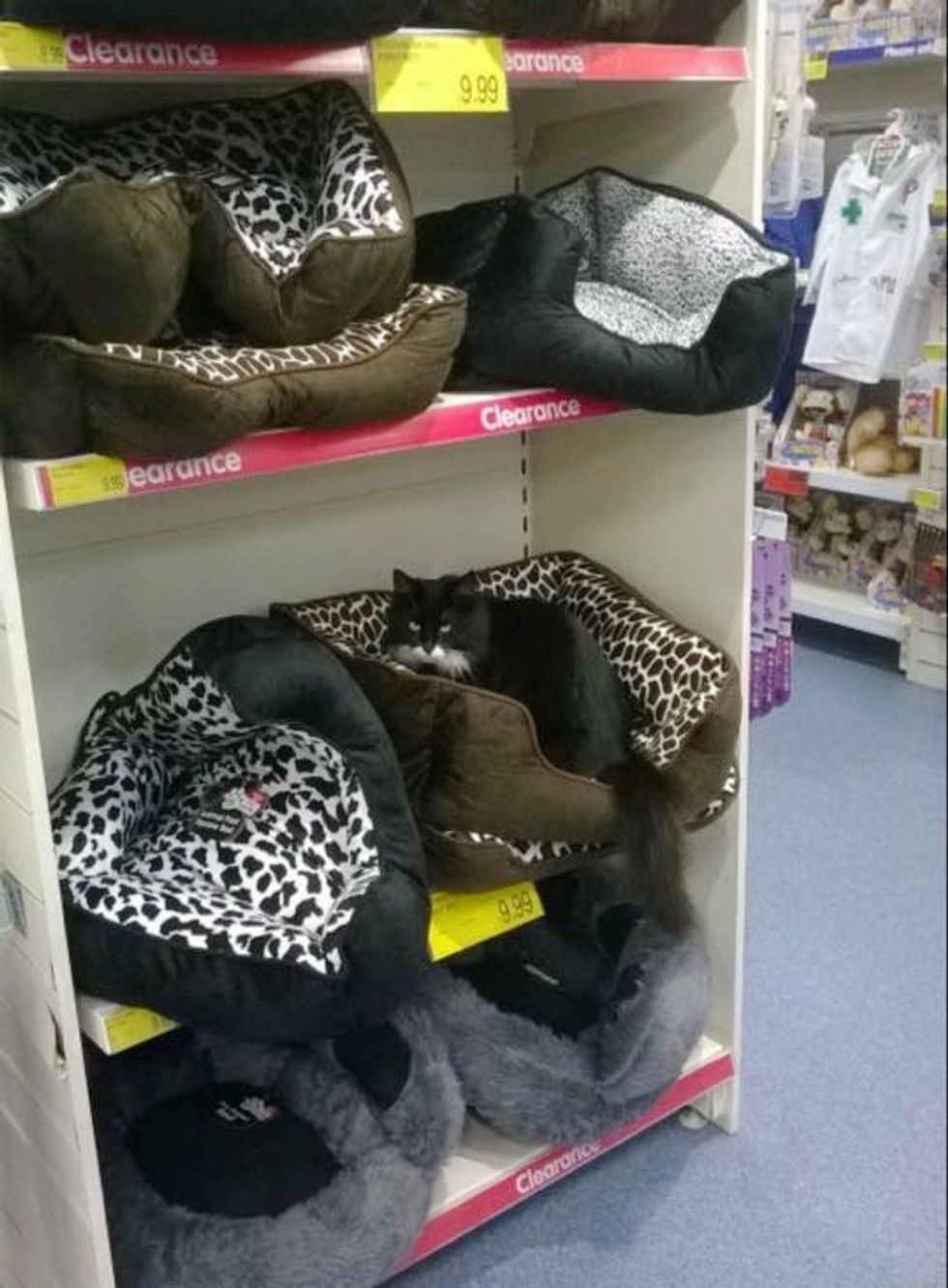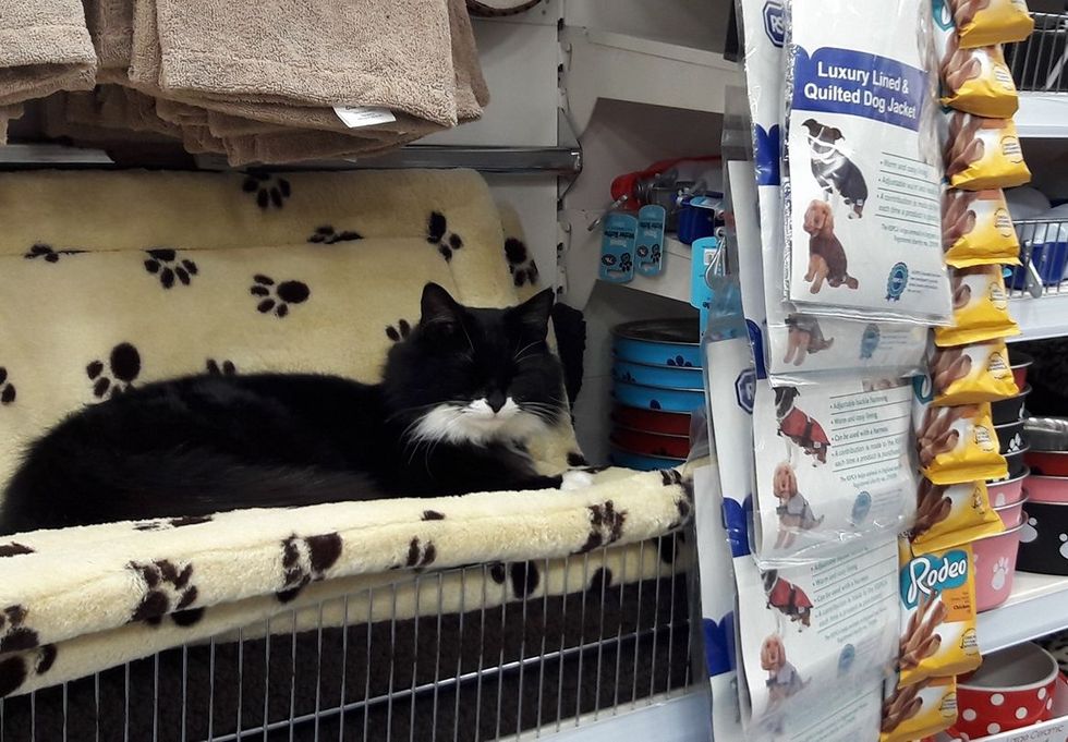 He's fully in charge of the pet section of the store, making sure everything is in order by cat standards. Though Sheldon likes to sleep at work in those comfortable pet beds, no one minds at all. It's just part of his job.