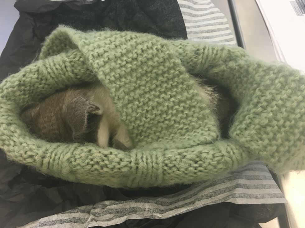 Lu fell asleep in her rescuer's hat after having some cat food, but the teeny fur baby was not out of the woods yet. "She wasn't able to stay awake, to eat drink or play. She wasn't cleaning herself, keeping food down, able to walk, hold her head up, nothing. Really scary."