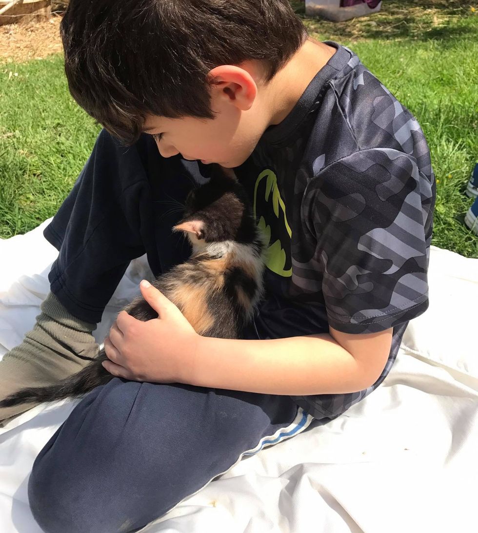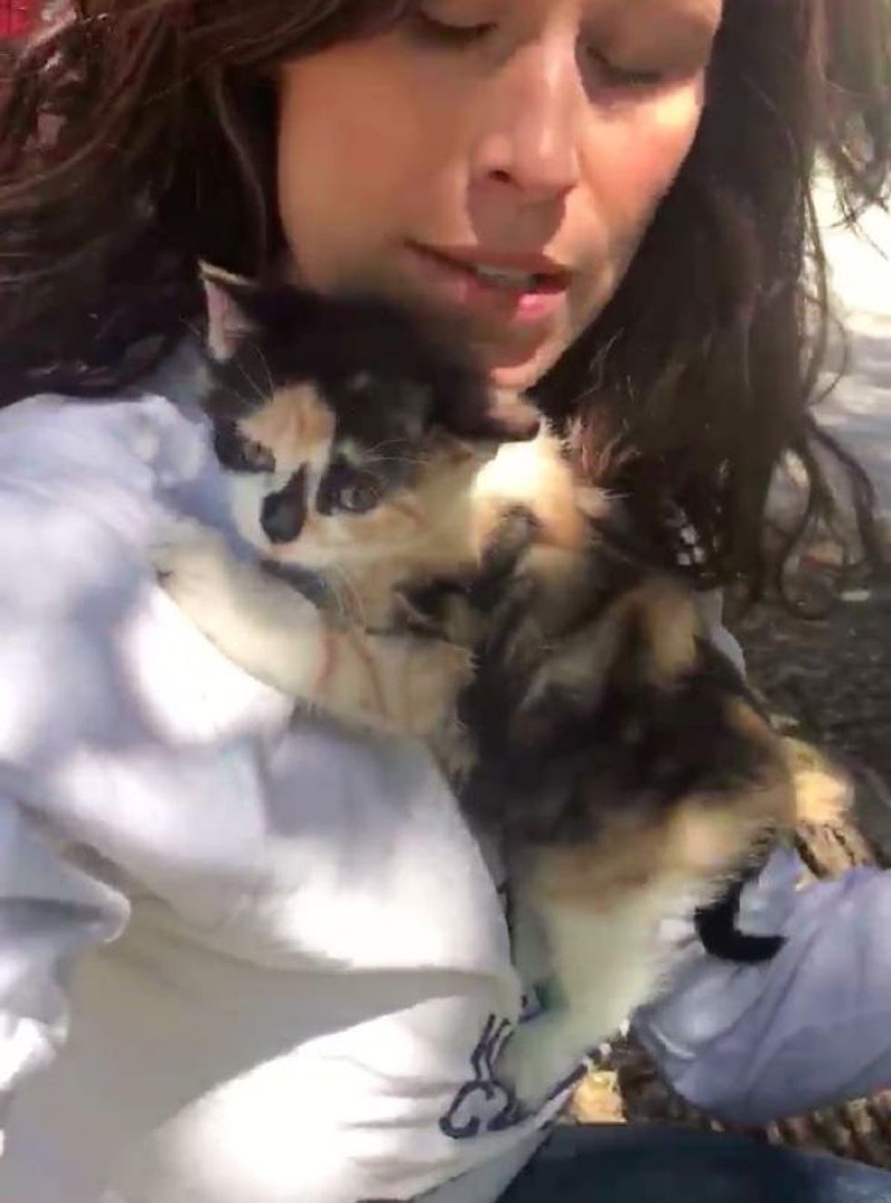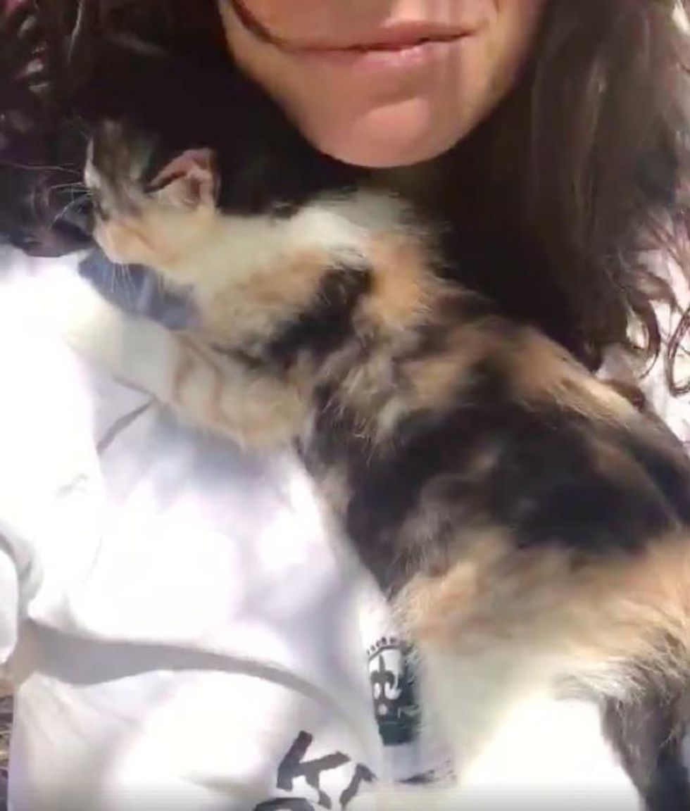 A woman hugged a kitten that no one wanted, and the tiny calico latched onto her and wouldn't let go...