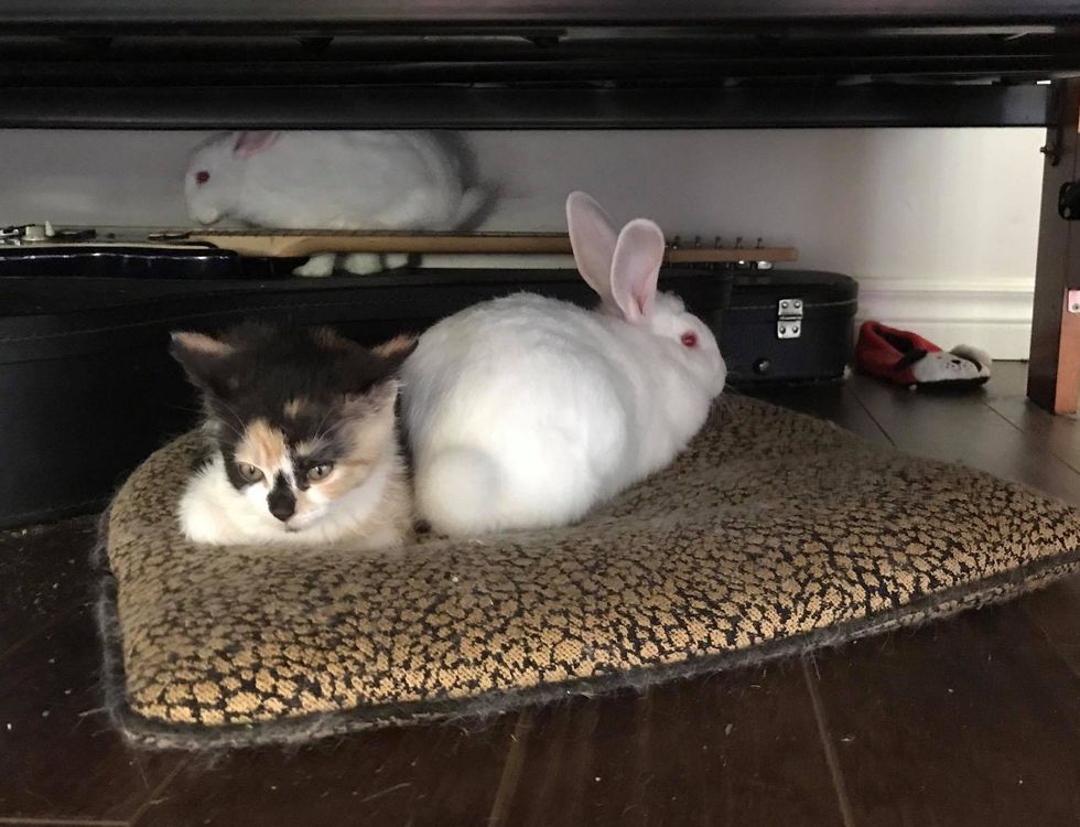 "She settled in now and is as happy as can be! She is bright, active, actually extremely active, curious, and just loves to play! She tries to engage the other six cats, and even plays with our rescue bunnies," Carla told Love Meow.