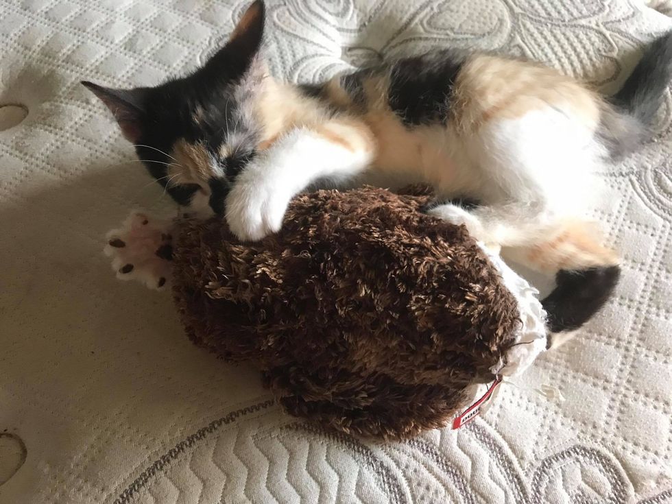 But what she loves the most is to cuddle with her rescuer, now forever human mom when she naps.