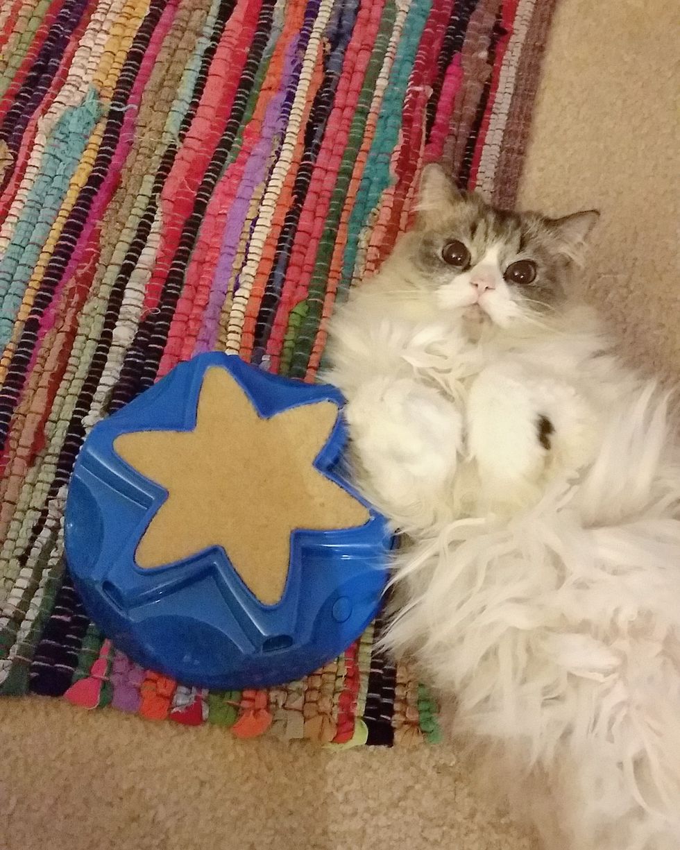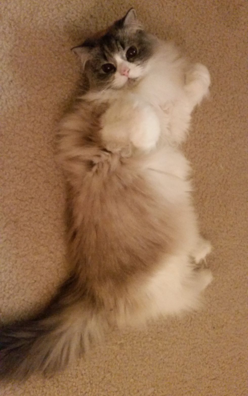 "She loves having her head and belly scratched! In fact, if you hold your hand flat over her, she will jump up and bop it with her nose. We call it her jumping headbutt!"